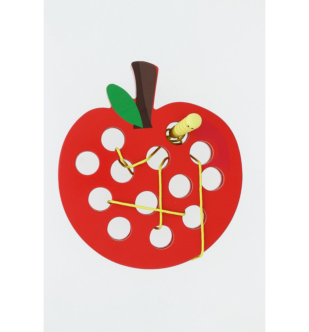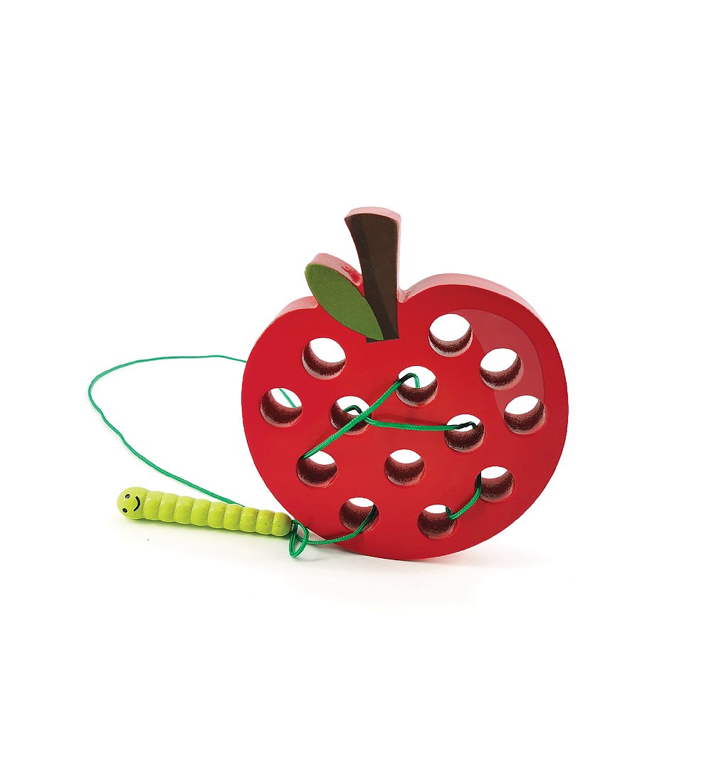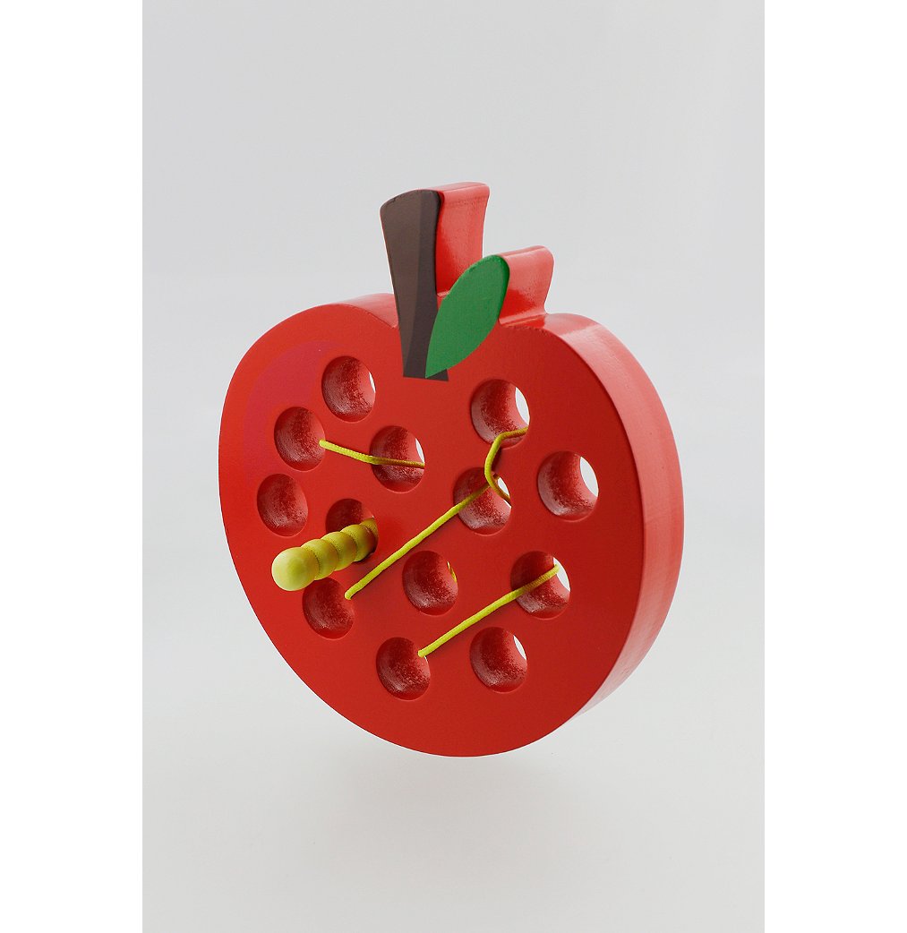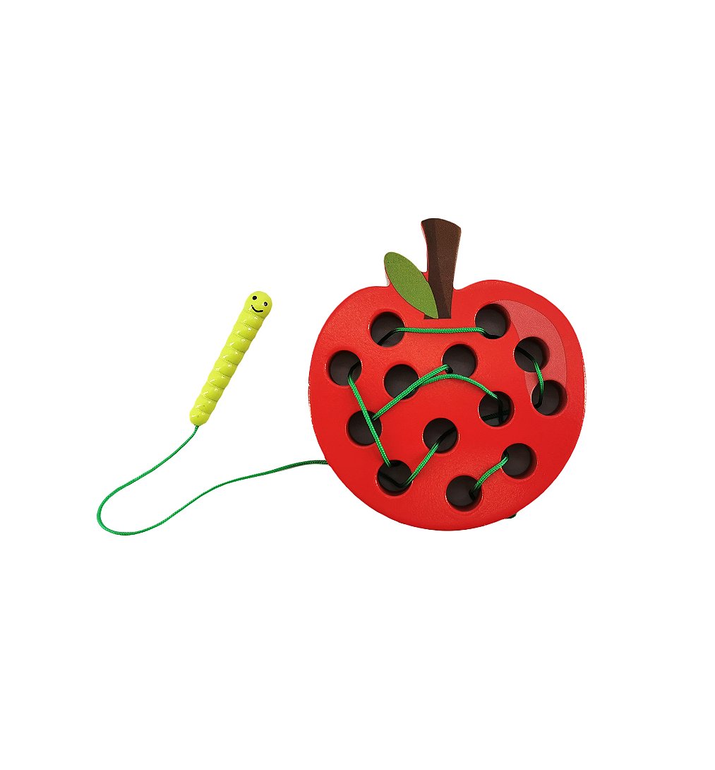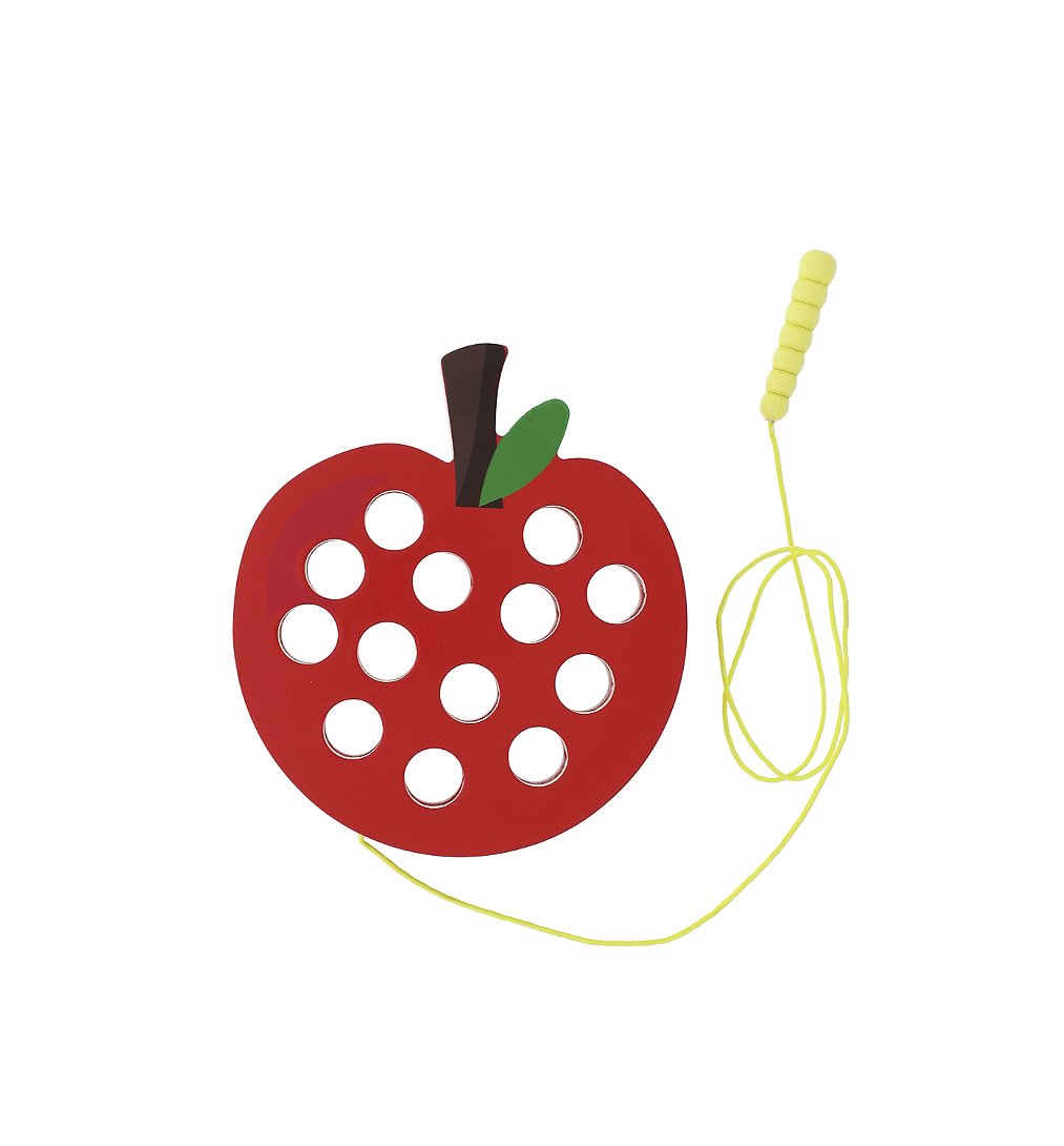 • Cette pomme à lacer en bois est accompagnée d'un petit ver en bois. Votre enfant s'amusera à lacer la pomme en suivant les trous avec le ver, répétant les gestes et développant sa précision.