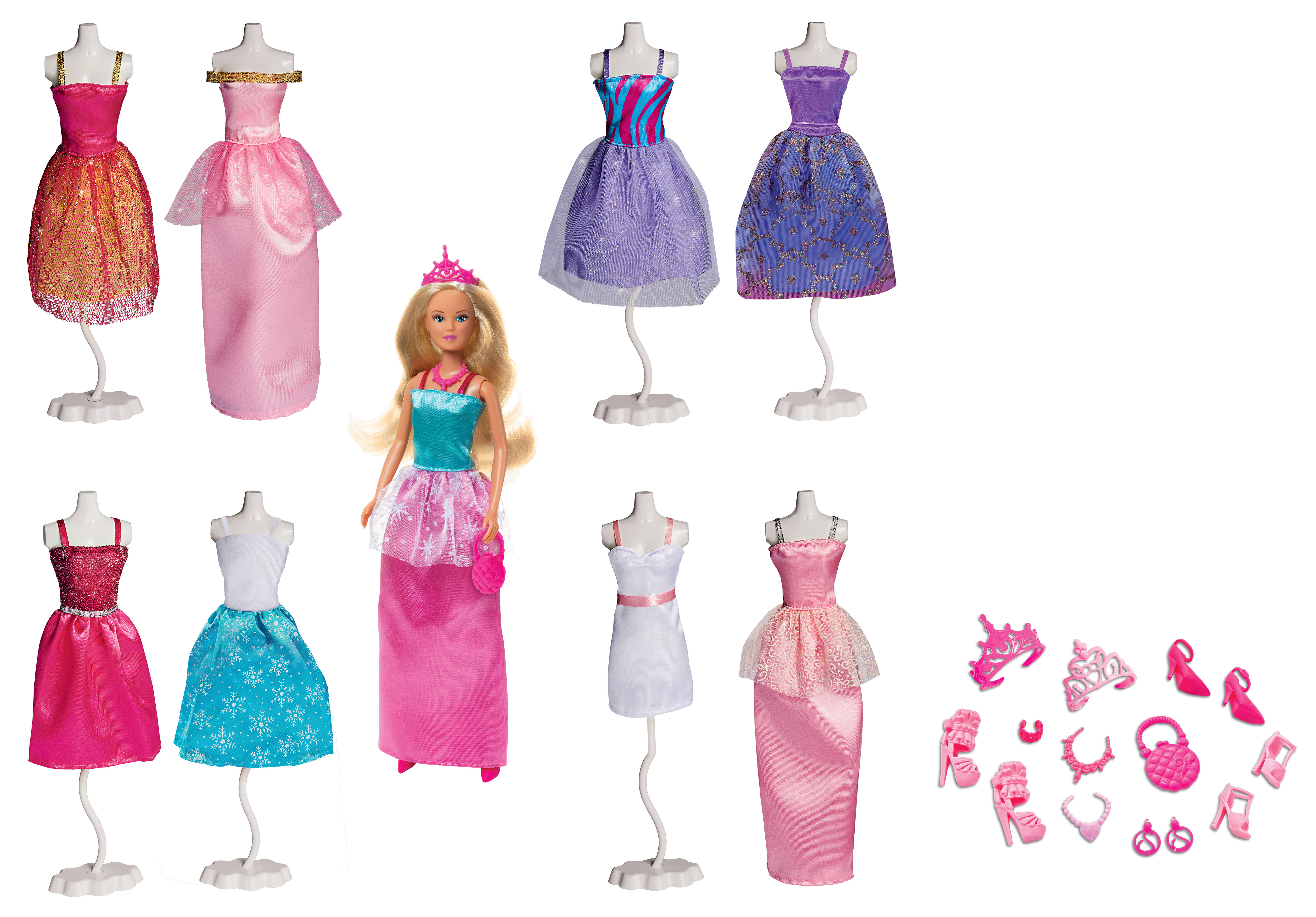 La boîte contient 1 poupée mannequin de 29cm, 9 robes de soirées, 8 accessoires (chaussures, sacs, couronnes).