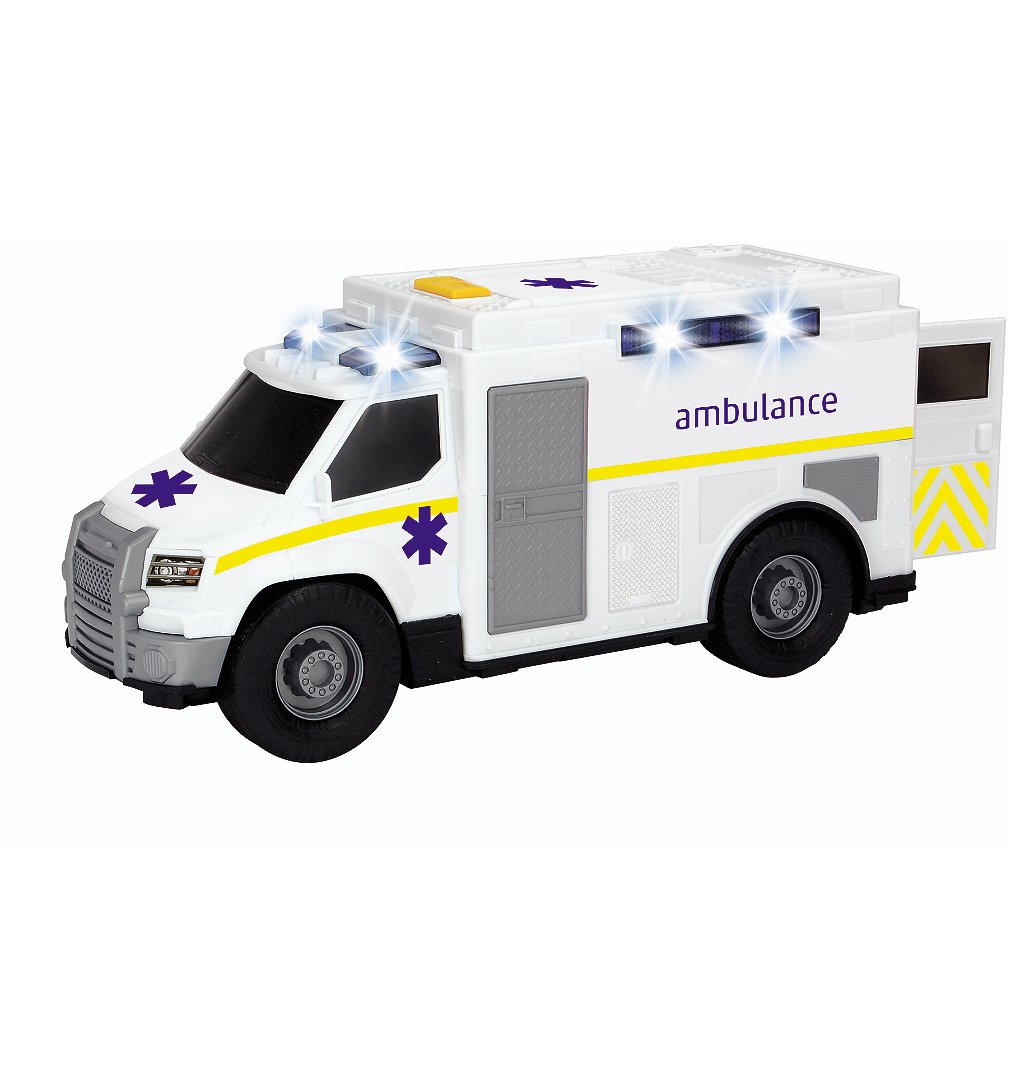 Cette ambulance avec sons et lumières est idéale pour les jeunes passionnés d'aventures. En appuyant sur un bouton, les sirènes retentissent et les gyrophares s’illuminent. Le véhicule est accompagné d'un brancart à roulettes pour permettre aux enfants de recréer des scènes de sauvetage.