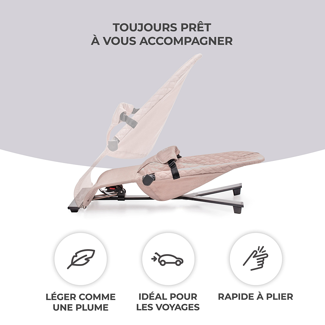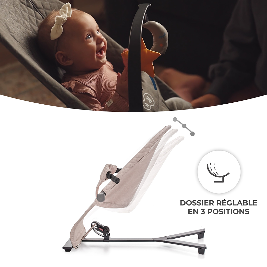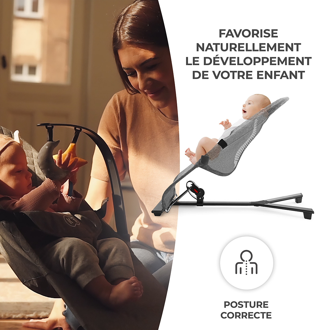 Un transat qui bouge au rythme de votre bébé. MIMI est un transat minimaliste qui apportera à votre enfant confort et détente dans un environnement approprié. Il contribuera à apaiser votre bébé même dans les moments de grande anxiété, et grâce à l'absence de stimuli excessifs, votre bébé aura la possibilité de se calmer plus rapidement. Cependant, le bambin a à sa disposition une arche détachable avec 2 jouets, qui rendra son moment de détente plus agréable. Le dossier MIMI peut être réglé sur 3 niveaux, ce qui vous permet d'adapter facilement le transat aux besoins de votre enfant. Le siège confortable en tissu agréable au toucher répartit uniformément le poids de l'enfant, favorisant une position de repos naturelle. Le transat est équipé de sangles et est très stable, ce qui vous permet de souffler un peu tout en sachant que votre tout-petit est en sécurité. Principaux avantages: - Un transat minimaliste pour votre bébé - Les mouvements naturels du bébé mettent le transat en mouvement, sans stimuli inutiles - Réglage du dossier à 3 niveaux - Très léger, se plie facilement - idéal pour les voyages. - Arche détachable avec 2 jouets