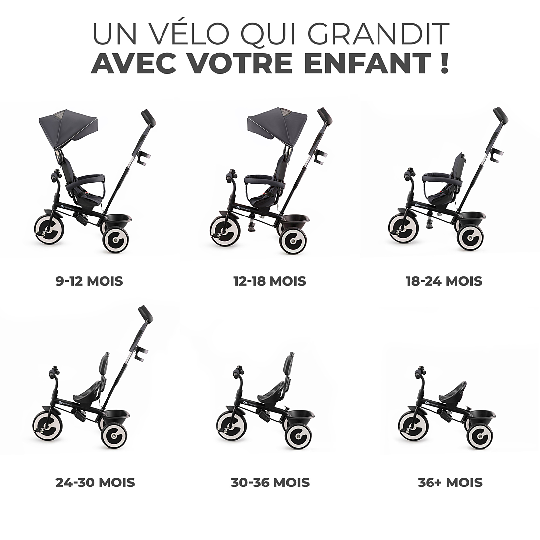 Le tricycle ASTON est destiné aux enfants de 9 mois à 5 ans. Grâce aux configurations possibles, le produit peut être facilement adapté à l'âge et à la taille de l'enfant. Il dispose d'un mécanisme qui relie le guidon parental au guidon de l'enfant, permettant au parent de garder un contrôle total sur le vélo, si nécessaire. Il est équipé d'un repose-pieds rabattable et de la possibilité de régler le siège face ou dos au sens de la route, ce qui rend les promenades confortables. Avantages Fonctionnalité: ● Le vélo est multifonctionnel - il peut également être utilisé par des enfants plus âgés (arceau, capote, poignée parentale amovibles). ● Grandes roues en mousse EVA increvables avec une durabilité accrue, vous n'aurez donc pas à vous soucier que les roues soient endommagées pendant la promenade. ● La fonction de roue libre permet à l'enfant de pédaler librement quelle que soit la personne qui conduit le vélo. ● Repose-pieds rabattable et possibilité de régler le siège face ou dos à la route. Sécurité: ● Ceintures à 5 points avec épaulettes et une ceinture supplémentaire entre les jambes, qui protègent l'enfant contre les chutes. ● Arceau pour l’enfant, qui lui offre une protection supplémentaire, avec la possibilité de démontage complet, ce qui permet aux enfants plus âgés de monter plus facilement sur le vélo. ● Freins sur les roues arrière, augmentant la sécurité lors des pauses et en rentrant et sortant l'enfant du tricycle. ● Un mécanisme qui relie le guidon parental avec le guidon pour l'enfant, permettant au parent de garder le contrôle total sur le vélo, lorsque cela est nécessaire. ● Produit testé et approuvé conformément aux normes de sécurité européennes EN 71-1. Confort: ● Une grande capote pliable qui protège l'enfant du soleil et du vent. Équipée d'une fenêtre supplémentaire qui permet au parent de voir l'enfant à tout moment. ● Réglage à 2 niveaux de la distance entre le siège et les pédales, ce qui permet un meilleur ajustement de l'enfant à la position derrière le volant. ● Réglage de la hauteur de la poignée parentale, permettant l'ajustement à la hauteur du parent. Fournit la commodité et le confort de conduite. La poignée est recouverte de mousse EVA. Accessoires inclus ● Un sac pratique pour les petits objets des parents, attaché à la poignée du volant ● Un porte-gobelet pour votre boisson préférée ● Un grand panier derrière le siège pour les articles nécessaires lors d'une promenade ou les jouets ● Sonnette pour l’enfant