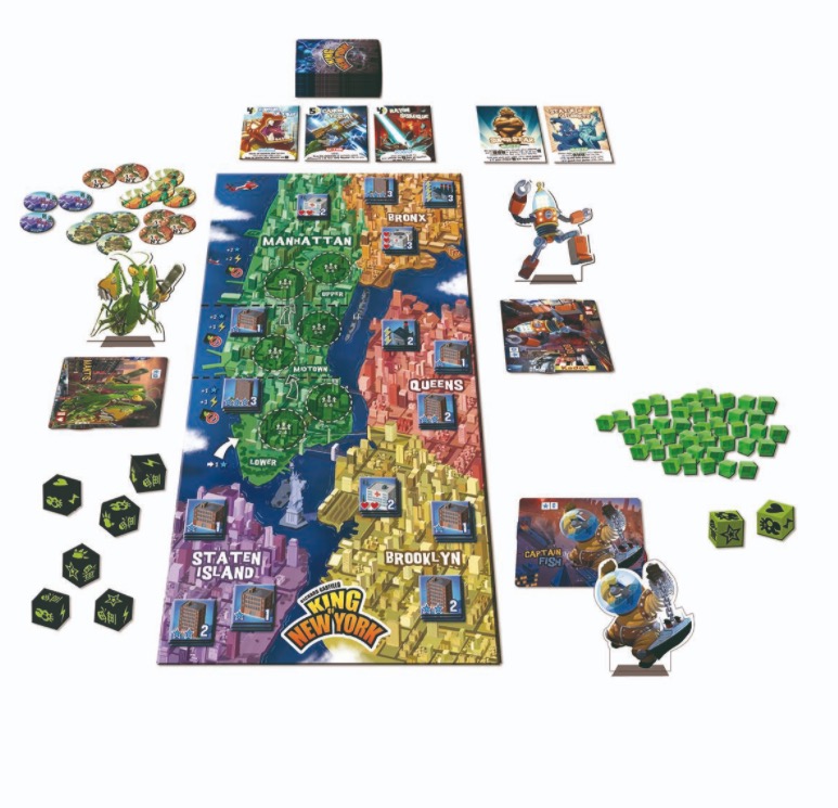 Matériel : 1 plateau, 64 cartes + 2 cartes spéciales Statue de la Liberté et Superstar, 46 marqueurs (13 Toiles, 13 Malédictions, 15 Carapaces, 5 Souvenir), 8 dés (6 noirs et 2 verts), 6 fiches de Monstres, 6 figurines cartonnées + 6 portes figurine, une cinquantaine de cubes d’Énergie, 45 tuiles Bâtiment/Unité, 1 livret de règles.