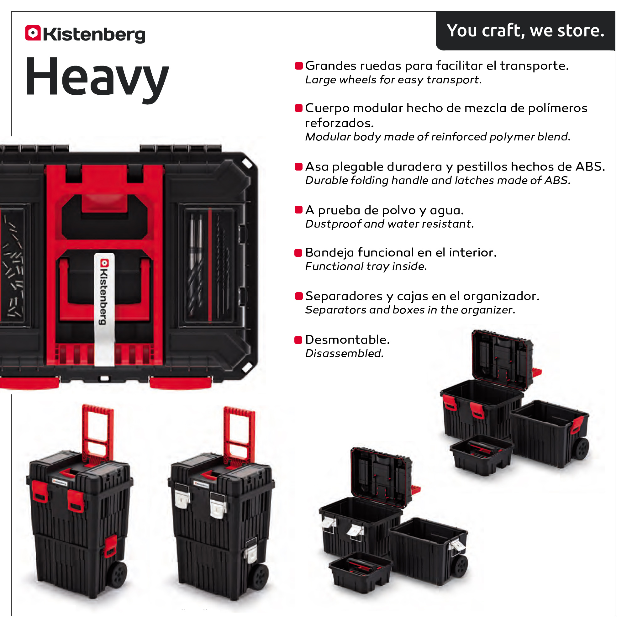 Boîte mobile lourde: Structure murale renforcée. - Grandes roues pour faciliter le transport de la boîte. - Corps modulaire en mélange de polymère renforcé. - Structure du mur renforcé. - Mango pliant durable en abdos. - Fixes en acier galvanisées fortes. - Une articulation solide garantit que le produit est poussiéreux et résistant à l'eau. - plateau fonctionnel à l'intérieur. - Organisateurs sur une couverture en polycarbonate avec des partitions et des bacs. - Il peut être démonté pour le transport.
