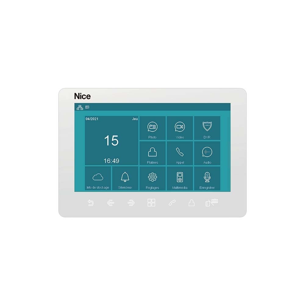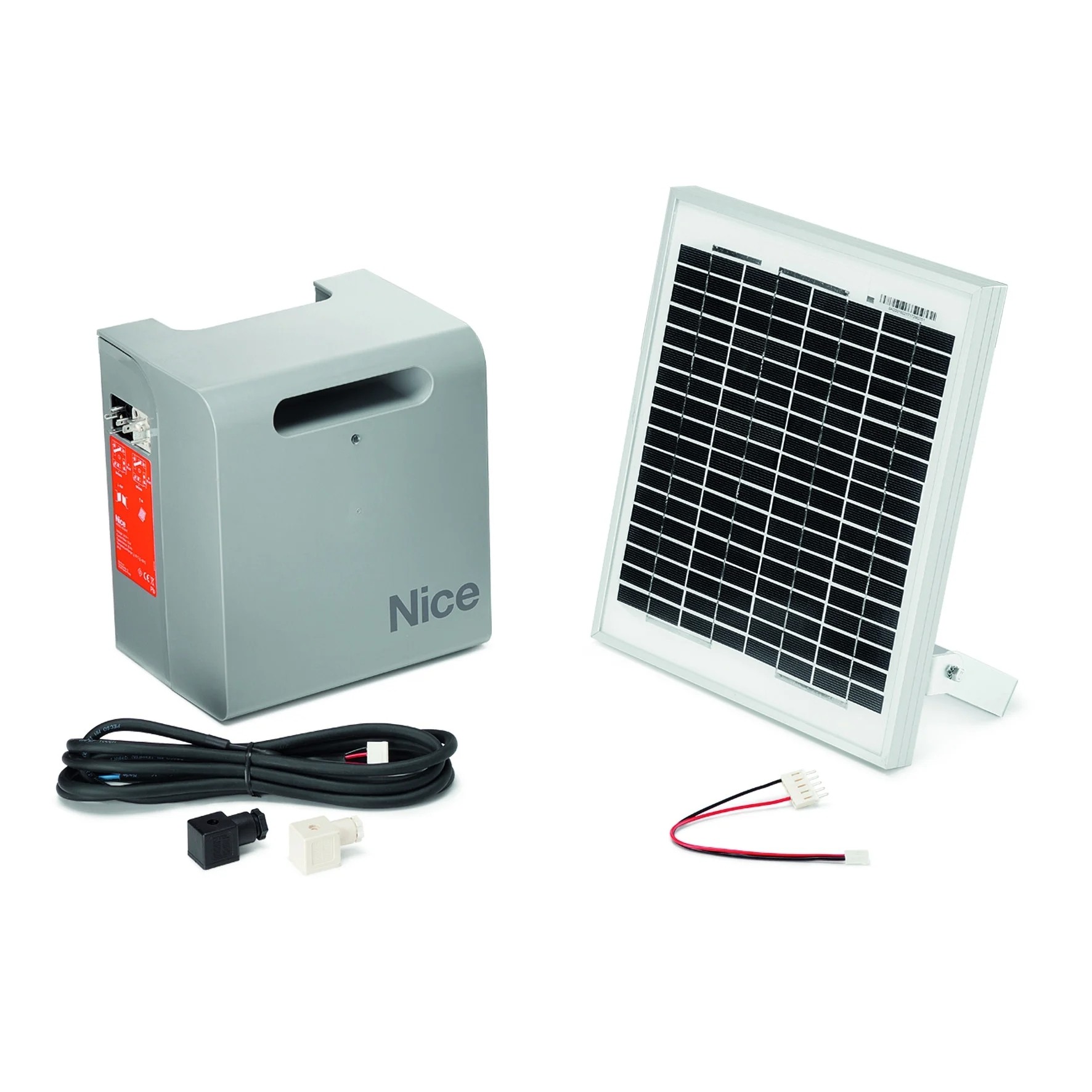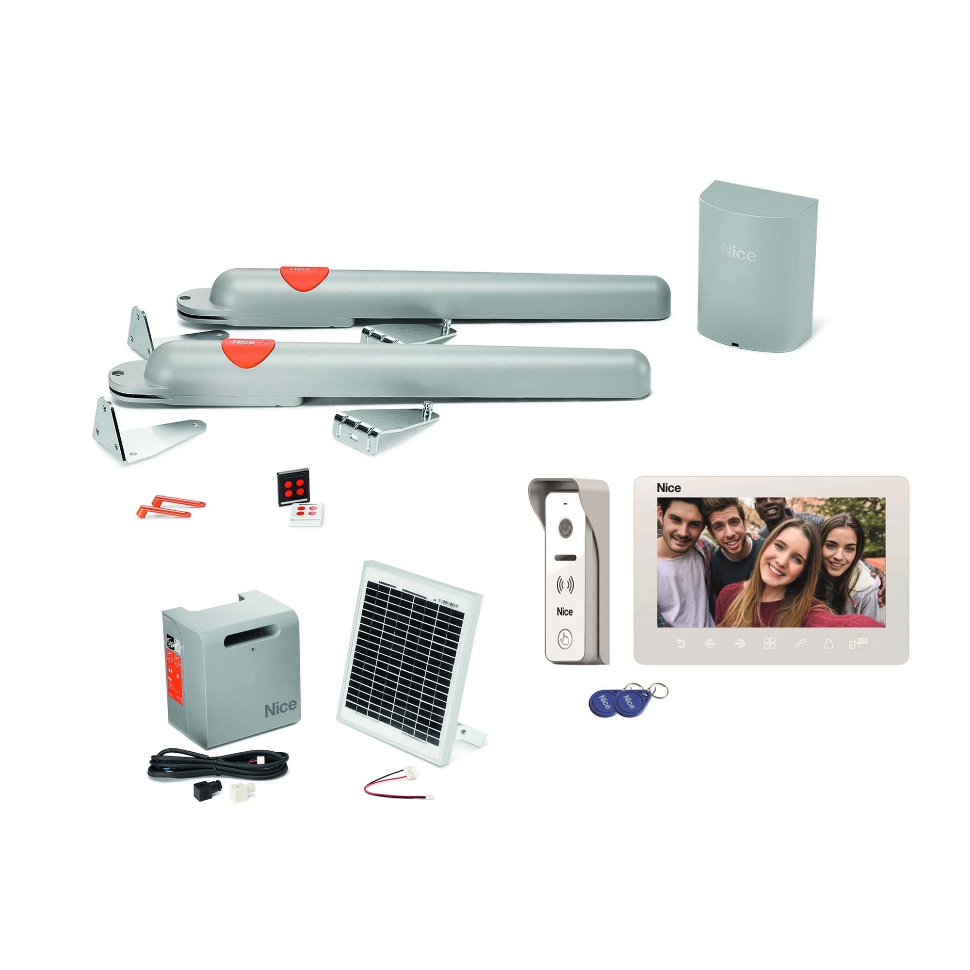 Motorisation Aria Start Kit 200 - Moteur à vérinsLe kit Aria 200 permet d'automatiser un portail lourd ayant une forte prise au vent. Le vantail ne doit pas excéder les 250 kg ou 2.20 mètres. Rapide et sûr : le Aria 200 effectue l'ouverture du portail en 14 secondes (hors zones d'accélération et de ralentissement) sur 90°, avec butées mécaniques en ouverture et fermeture.Puissant et robuste : le moteur à vérins fournit jusqu'à 1230 Nm, capacité de 30 cycles/heure.Pratique : le déverrouillage est placé sur le haut du moteur pour une intervention d'urgence. Cette motorisation dispose d'une ouverture piétonne réglable et d'une détection d'obstacles.Installation simplifiée : Sa pose est grandement facilitée grâce aux platines de fixation réglables et au moteur pré-câblé. Compatible avec l'alimentation solaire SoleKit.Visiophone filaire 1 appel Mira 100Le MIRA 100 est un visiophone 2 fils, design et discret, permettant de communiquer avec vos visiteurs et ouvrir le portail et portillon depuis votre habitat. Le moniteur est doté d'un écran couleur 7" avec touches sensitives ainsi que d'une mémoire interne et carte SD de 16 GB pour enregistrer les photos et vidéos lors d'appel de vos visiteurs en votre absence. La platine de rue offre une résistance accrue à l'eau (IP66) et une excellente résolution d'image grâce à sa caméra HD et grand angle (110°), même de nuit à l'aide de la vision nocturne.Vous pourrez ainsi gérer l'ouverture de votre portail et portillon depuis le lecteur de badges se situant sur la platine de rue et les badges inclus dans votre kit. Il vous sera possible d'installer jusqu'à 3 écrans supplémentaires (en option) dans votre habitat La distance maximum entre le moniteur intérieur et la platine de rue est de 150 m avec 2 fils de 0,75 mm² minimum.Kit d'alimentation solaire Nice Home - Motorisation de portailAdapté pour un moteur de portail, cette alimentation à l'énergie solaire vous permet de faire fonctionner votre portail sans avoir recours au secteur électrique. Aucun travaux de raccordement n'est nécessaire. Aucun risque de coupure électrique, le portail reste opérationnel. Simple d'installation, SOLEKIT peut également être connecté à des logiques de commande différentes de la gamme Nice Home; se reporter à la notice des logiques pour effectuer la connexion électrique.Composition du kit : 2 moteurs Aria1 centrale de commande2 télécommandes 5 touches1 visiophone Mira 1001 kit solaire SoleKit
