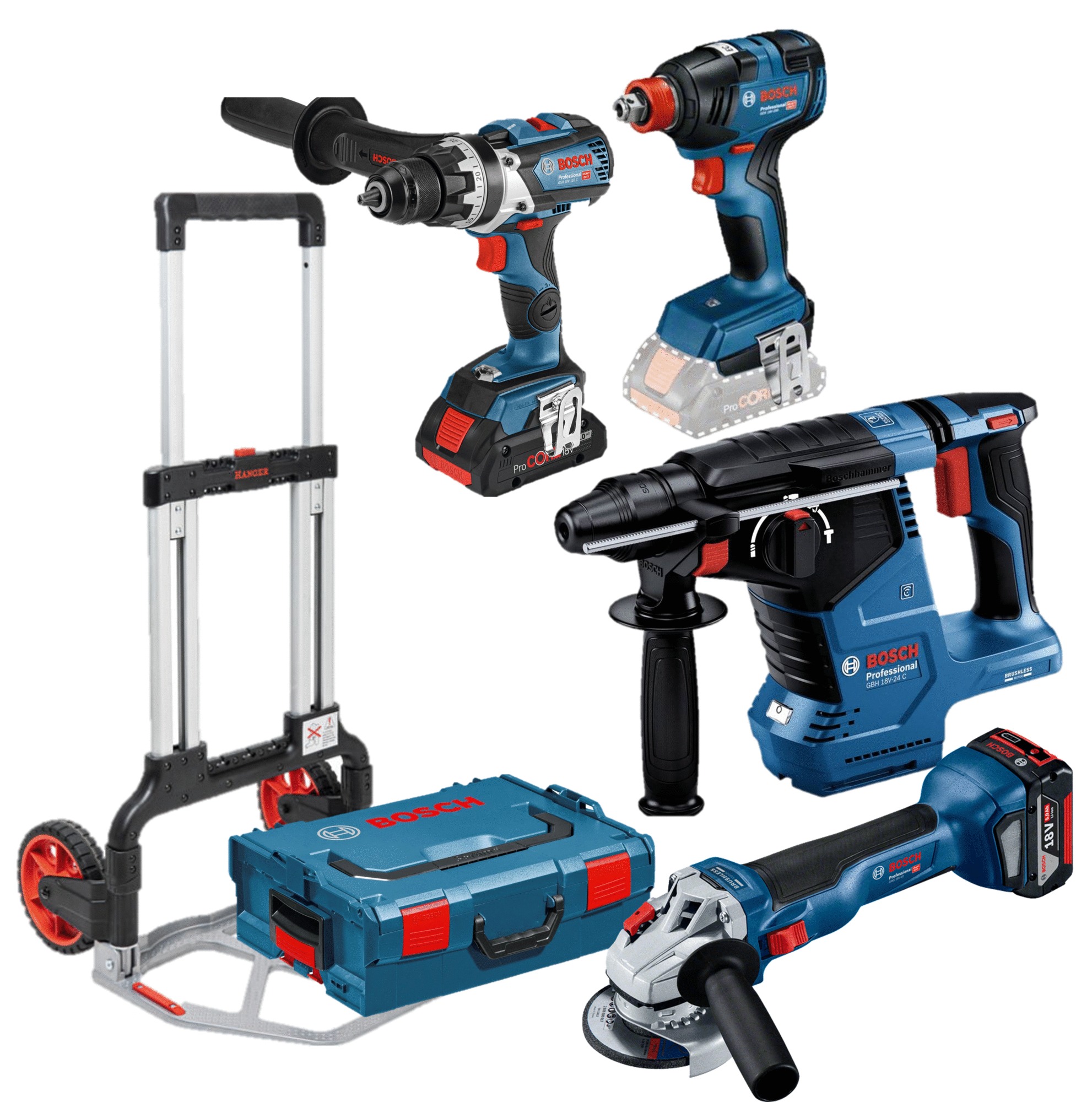 Libellé Kit 4 outils 18V (GSR110 + GDX210 + GWS10 + GBH24) + 3 batteries + chargeur + coffret L-BOXX + diable - BOSCH