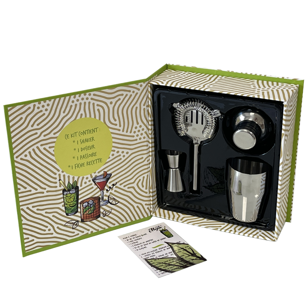 Kit à cocktails Mojito Coffret cadeau contenant : 1 Shaker 1 doseur 1 passoire 1 fiche recette En métal Dimensions du coffret cadeau : Hauteur 26 cm - Largeur 23 cm - Profondeur 8 cm
