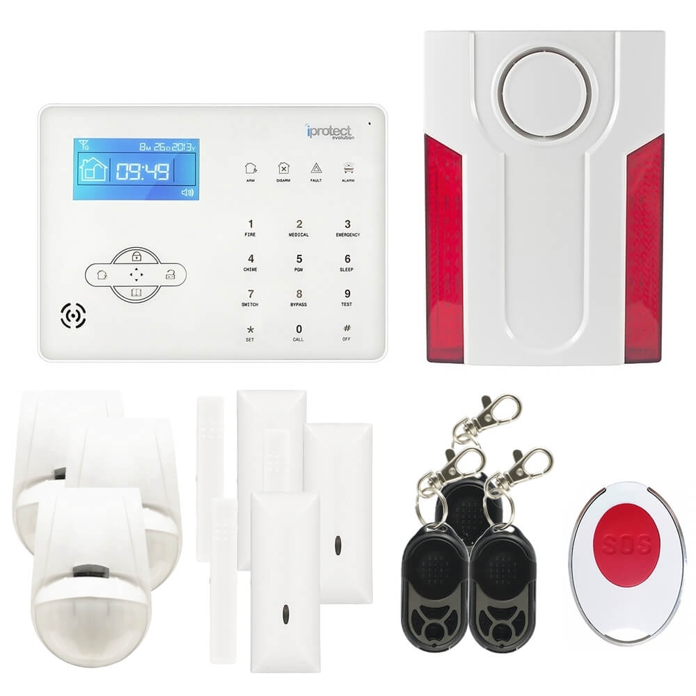 La centrale IPROTECT EVOLUTION RTC vous permet de personnaliser votre système d'alarme selon vos besoins. Restez informé d'une intrusion lors de votre absence.Armez totalement, armez partiellement, désarmez et interrogez le statut de votre centrale même à l'autre bout du monde.La centrale est évolutive et peut accueillir jusqu'à 32 détecteurs sans fil, 8 filaires et 8 télécommandes. Elle est pourvue d'une puissante sirène de 110dB.Elle est entièrement tactile et son écran LCD rétro-éclairé pour un confort d'utilisation optimal. Elle est conçue pour Alerter jusqu'à 4 numéros fixes ou mobiles et Compatible avec centre de télésurveillance (ADEMCO CID).Les menu, guide vocal, manuel d'utilisation sont en français. Elle est alimentée par secteur en 15V et est dotée d'une batterie de secours en cas de coupure de courant. La centrale peut être armée selon 2 modes : armement total et armement partiel. Elle peut également être déclenchée en mode ""panique".Le transmetteur téléphonique intégré DTMF est compatible avec les Ligne FT, ADSL et dégroupage TOTAL.Elle peut être contrôlée à distance via un téléphone. Grâce au système broadcasting anti-brouillage, elle est inviolable et inimitable.Alarme sans fil composée de :1 centrale d'alarme tactile avec transmetteur RTC intégré3 détecteurs de porte3 détecteurs volumétriques (imm. animale 15Kg)3 porte-clés télécommandes1 télécommande d'urgence1 Sirène extérieur flash