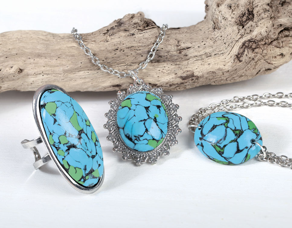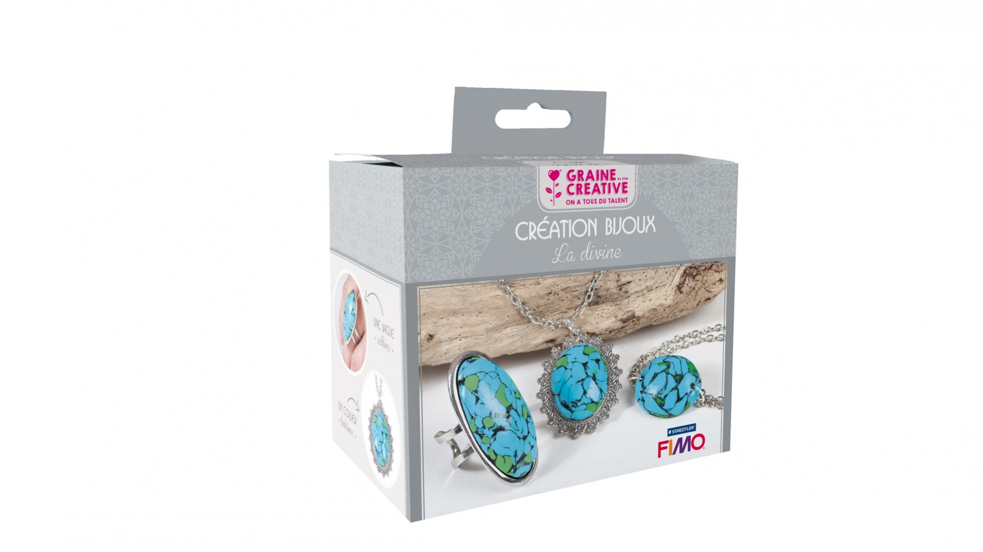 COFFRET DE CREATION "LA DIVINE" POUR CRÉER VOS PARURES DE BIJOUX TENDANCE. CONTENU: 1/2 pain FIMO® soft vert pomme n°50 1/2 pain FIMO® soft menthe n°39 1 m de chaîne 2 fermoirs 6 anneaux brisés 1 pendentif ovale 1 support de bague ovale 1 mini dose de peinture noire 1 mode d'emploi illustré