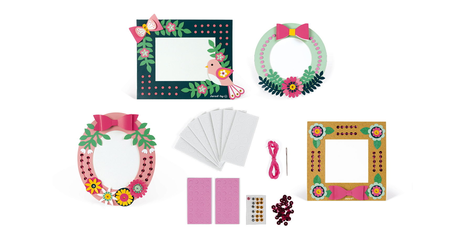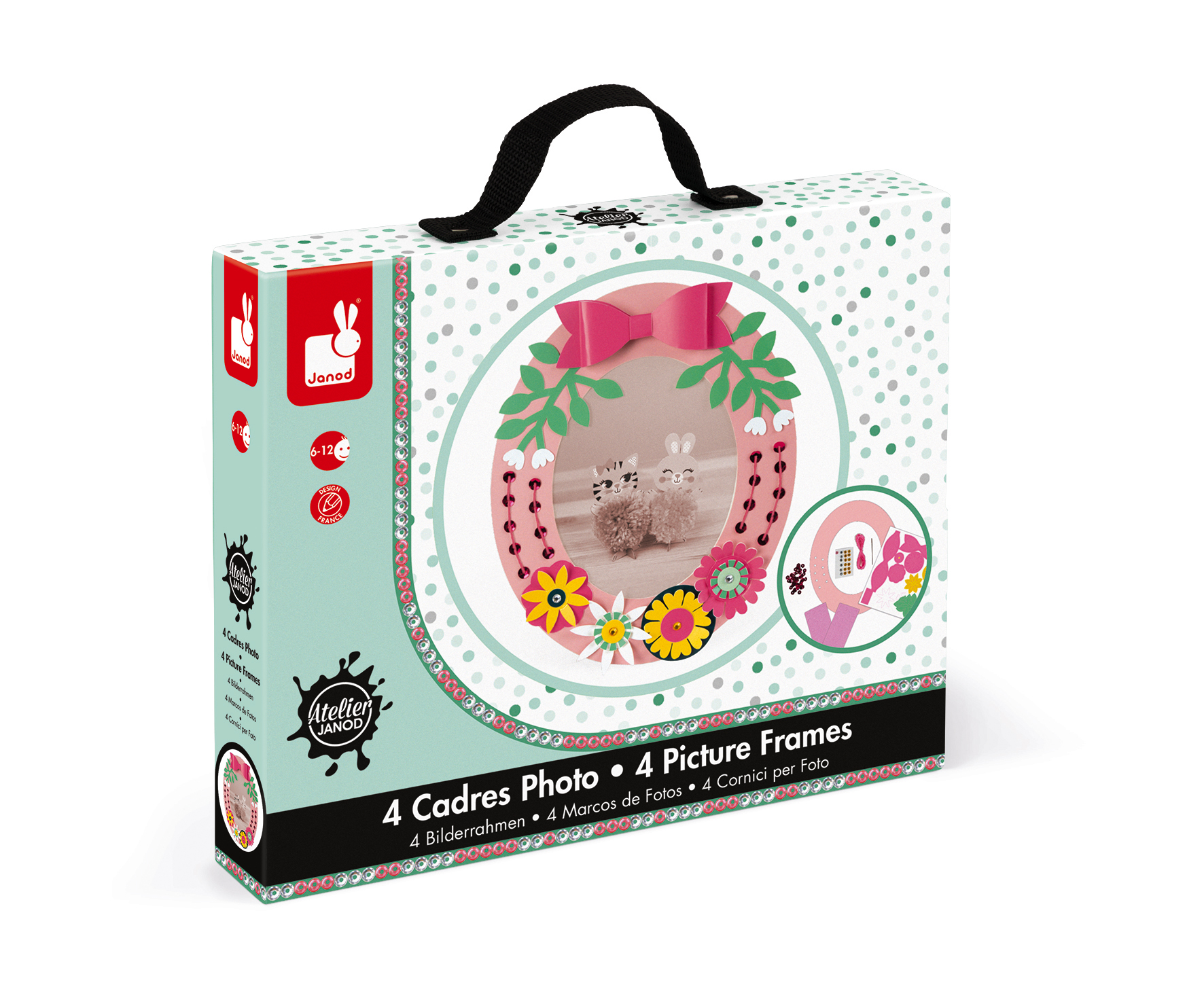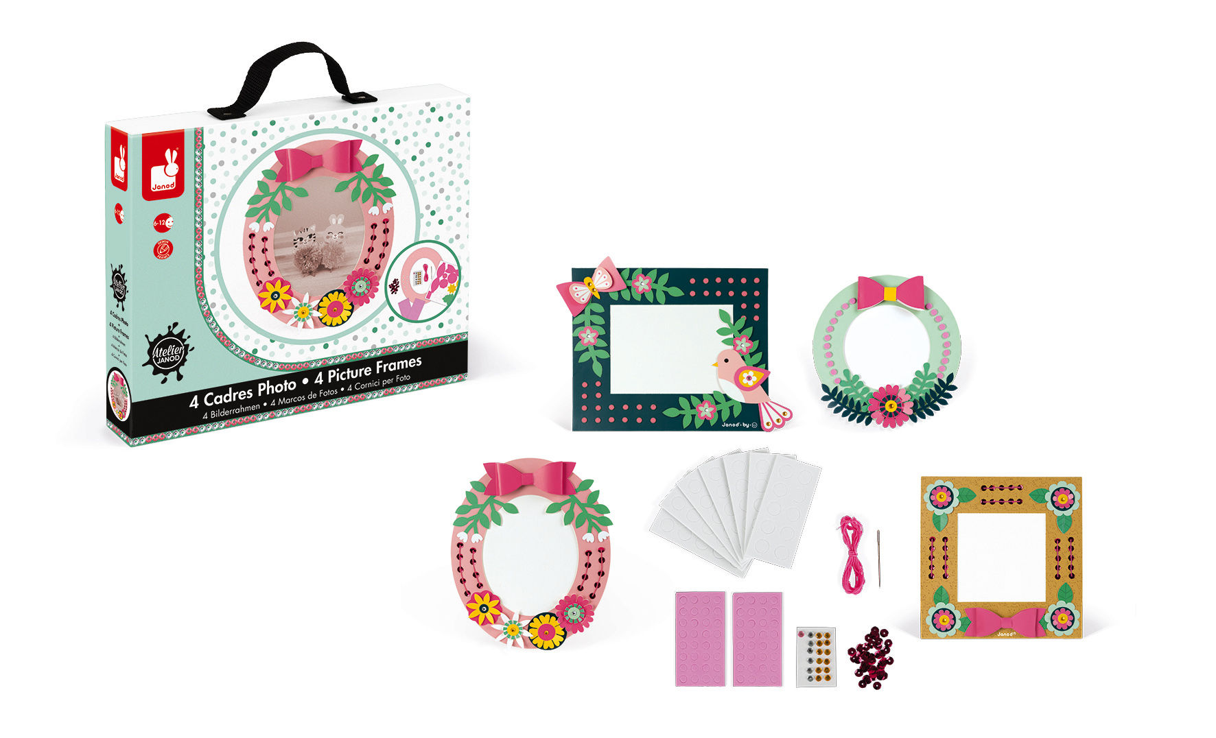 Crée 4 magnifiques cadres photo. Pour cela, tu disposes de nombreux accessoires : des fleurs, des nœuds papillon, des feuilles, des mosaïques en mousse et des strass à coller, des sequins à broder. Une fois terminés, tu n’auras plus qu’à glisser tes plus belles photos pour accrocher les cadres au mur. Cette activité est parfaite pour développer la concentration et l’habileté manuelle. Cadres de différentes formes et taille : (27 x 20,5 cm / 17,5 x 21 cm / 19,5 x 19,5 cm / 15 x 15,5 cm). Contenu : 4 cadres, 56 éléments en carton, 48 sequins, 70 autocollants double face, 19 strass, 56 mosaïques rondes en mousse autocollantes, 1 ficelle en coton de 2 m, 1 aiguille. Possibilité de les suspendre à l'aide d'une attache ou de les poser à l'aide du pied fixé au dos. Notice explicative prévue en 7 langues (français, anglais, allemand, néerlandais, espagnol, italien et russe). Mallette en carton avec poignée tissu