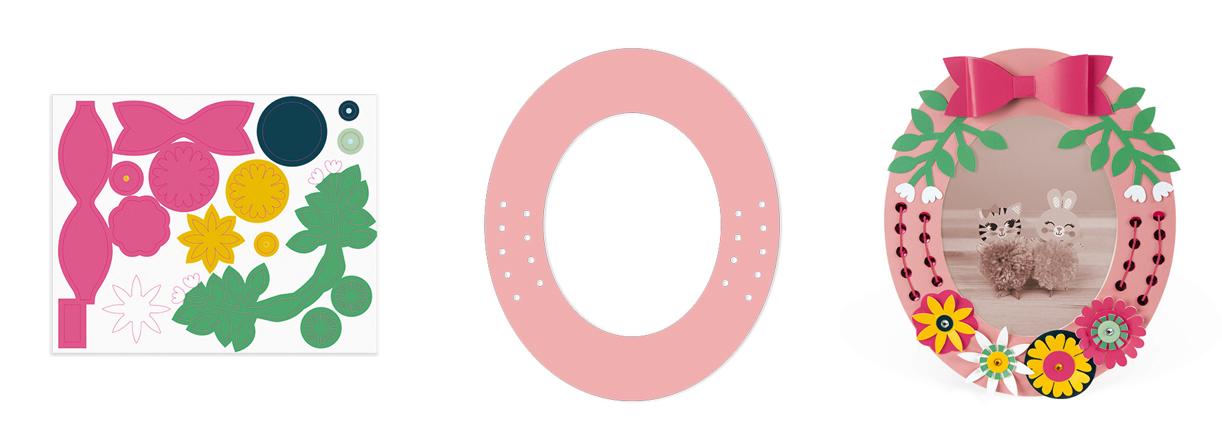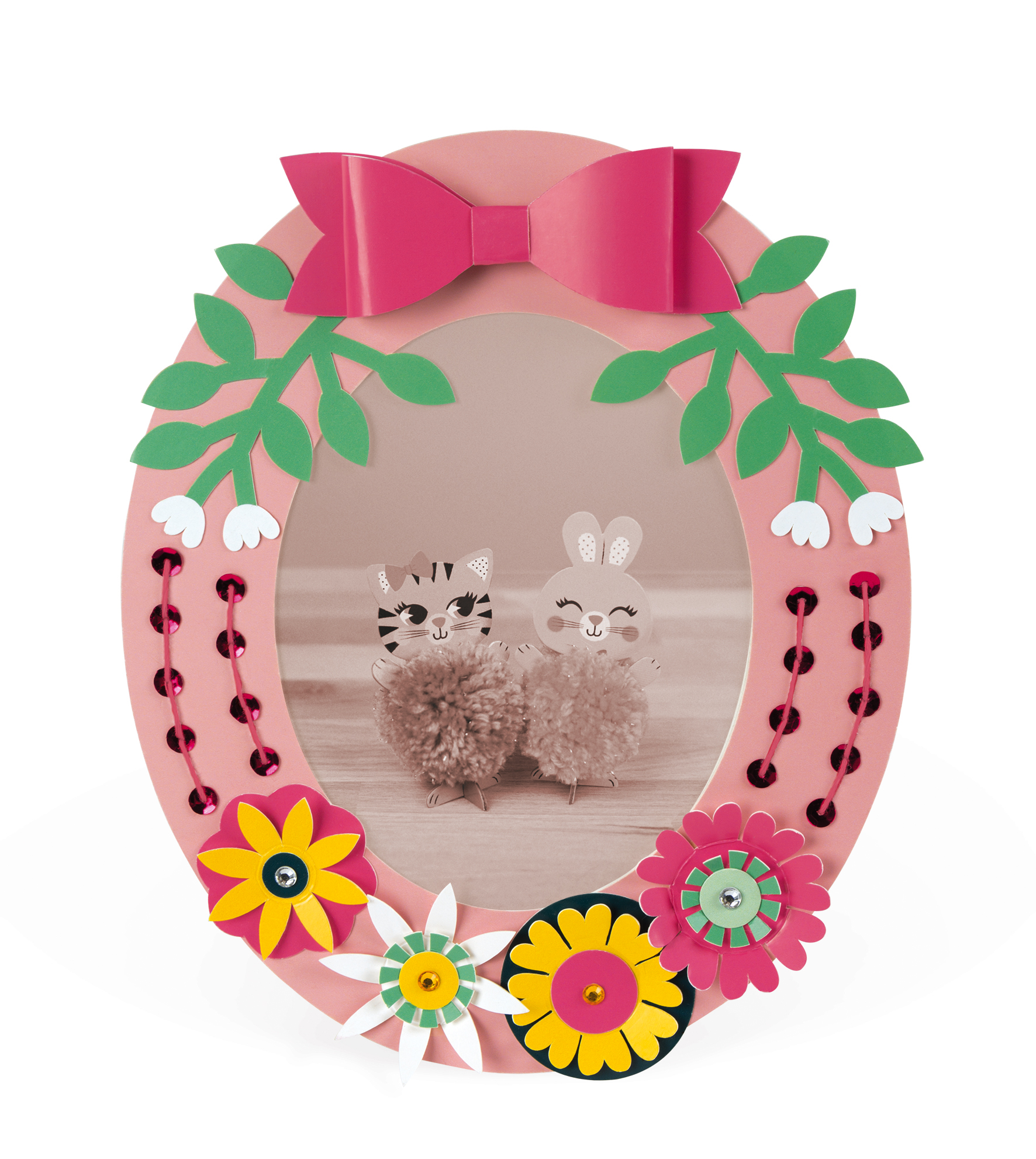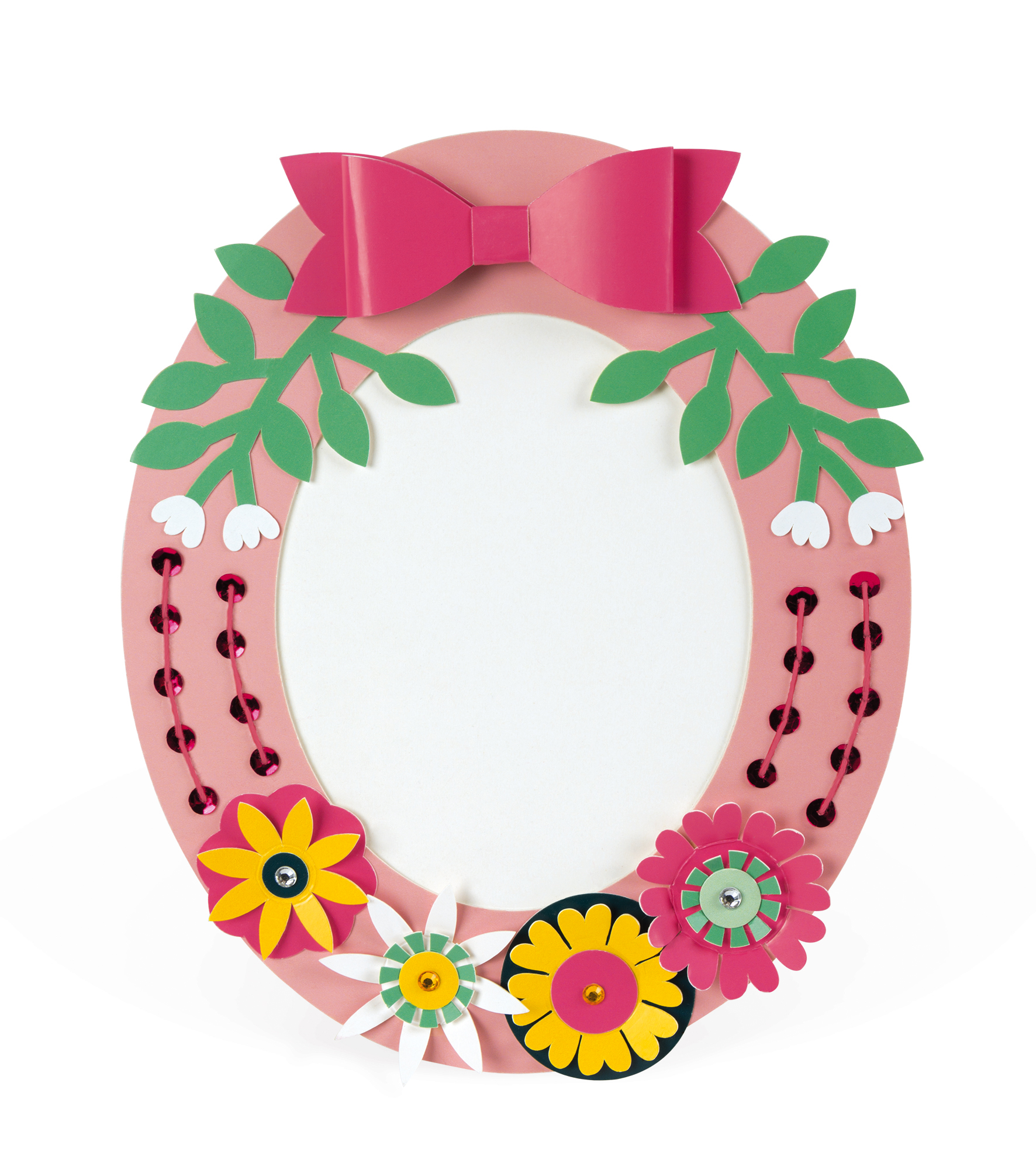 Crée 4 magnifiques cadres photo. Pour cela, tu disposes de nombreux accessoires : des fleurs, des nœuds papillon, des feuilles, des mosaïques en mousse et des strass à coller, des sequins à broder. Une fois terminés, tu n’auras plus qu’à glisser tes plus belles photos pour accrocher les cadres au mur. Cette activité est parfaite pour développer la concentration et l’habileté manuelle. Cadres de différentes formes et taille : (27 x 20,5 cm / 17,5 x 21 cm / 19,5 x 19,5 cm / 15 x 15,5 cm). Contenu : 4 cadres, 56 éléments en carton, 48 sequins, 70 autocollants double face, 19 strass, 56 mosaïques rondes en mousse autocollantes, 1 ficelle en coton de 2 m, 1 aiguille. Possibilité de les suspendre à l'aide d'une attache ou de les poser à l'aide du pied fixé au dos. Notice explicative prévue en 7 langues (français, anglais, allemand, néerlandais, espagnol, italien et russe). Mallette en carton avec poignée tissu
