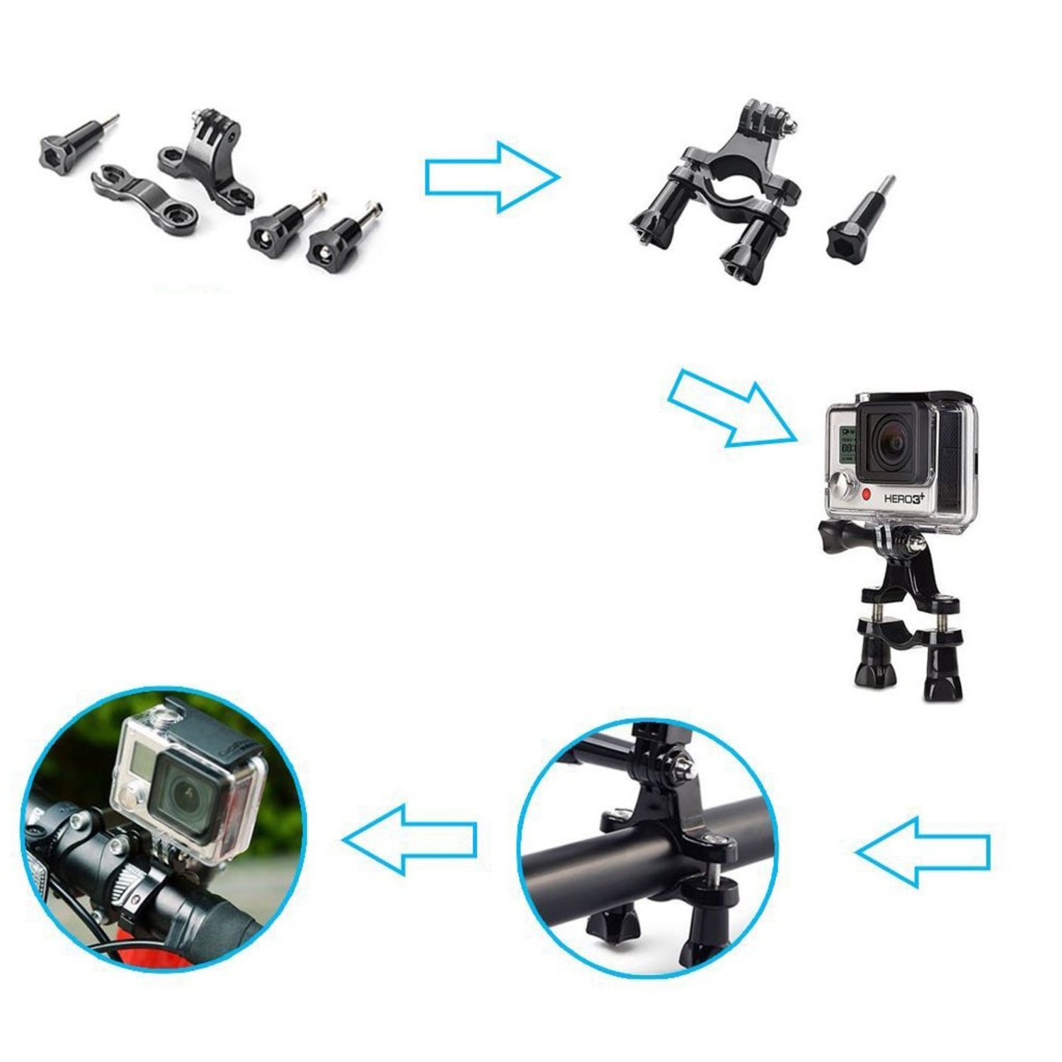 Fixation vélo : Fixation vélo robuste en métal, résistante à l'eau et traitée anti-corrosion. Facile à installer sur le guidon ou le cadre de votre vélo ou moto. La caméra d'action se fixe facilement au support de vélo, mais veillez à la fixer correctement afin que la caméra soit bien fixée dans le support. Le support de la caméra peut être tourné à 360 degrés pour trouver la meilleure position, la caméra reste alors stable une fois que vous avez choisi le bon angle. Le diamètre est si grand que le support vélo convient également aux VTT, motos, motocross et plus encore.