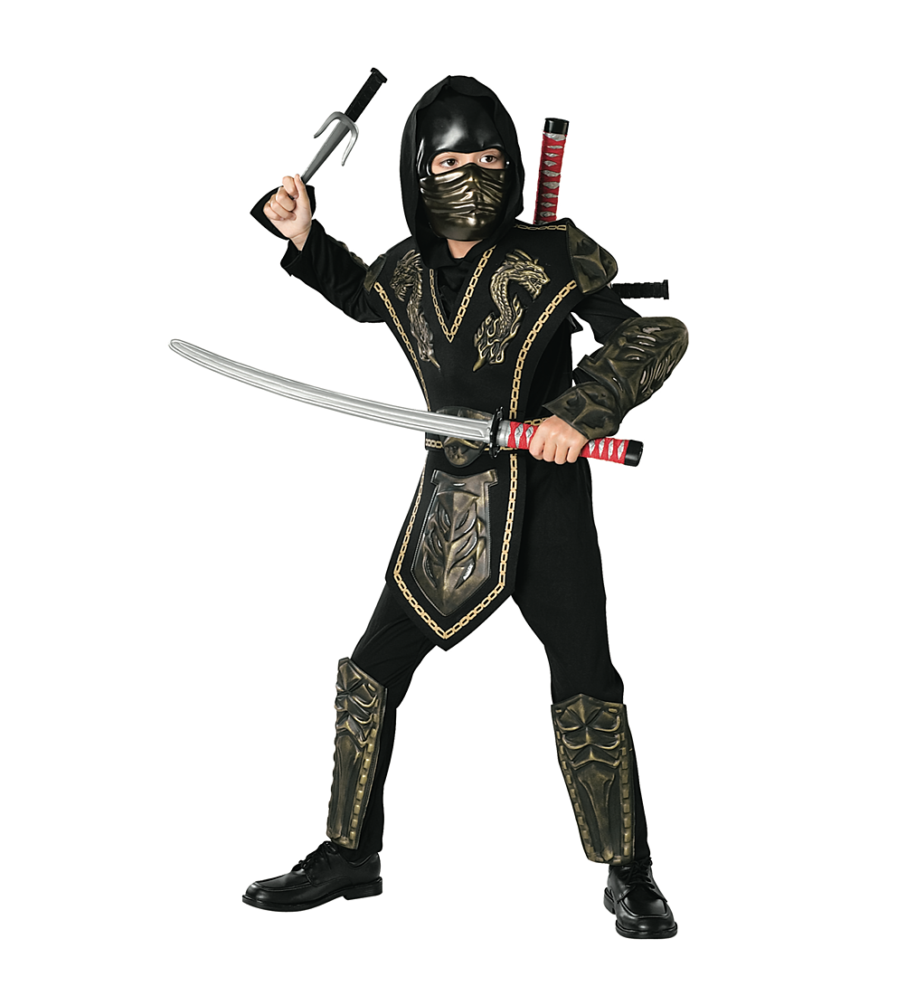 Un porte armes avec sangles pour l’attacher au dos, 2 sabres ninjas (hauteur 71cm),2 couteaux ninja (hauteur 23cm)