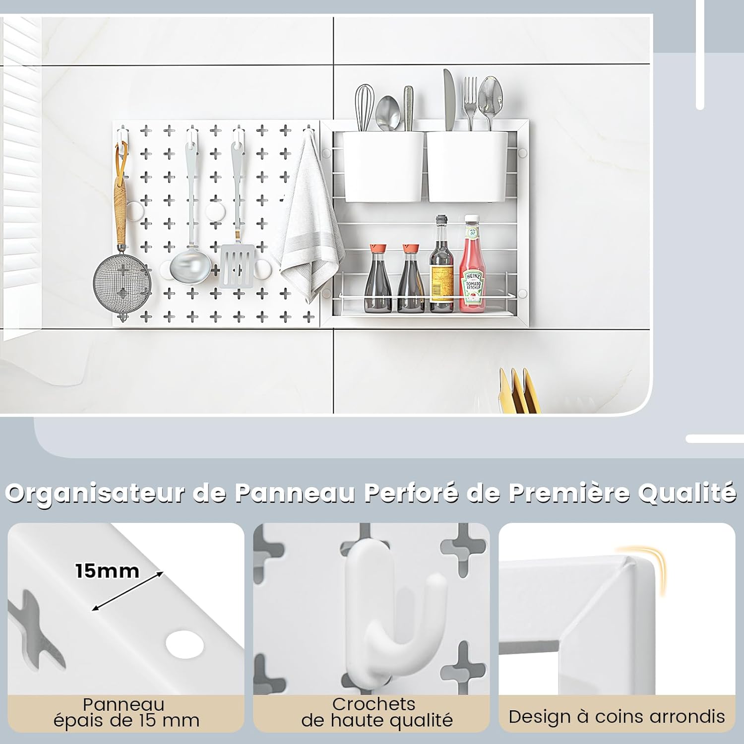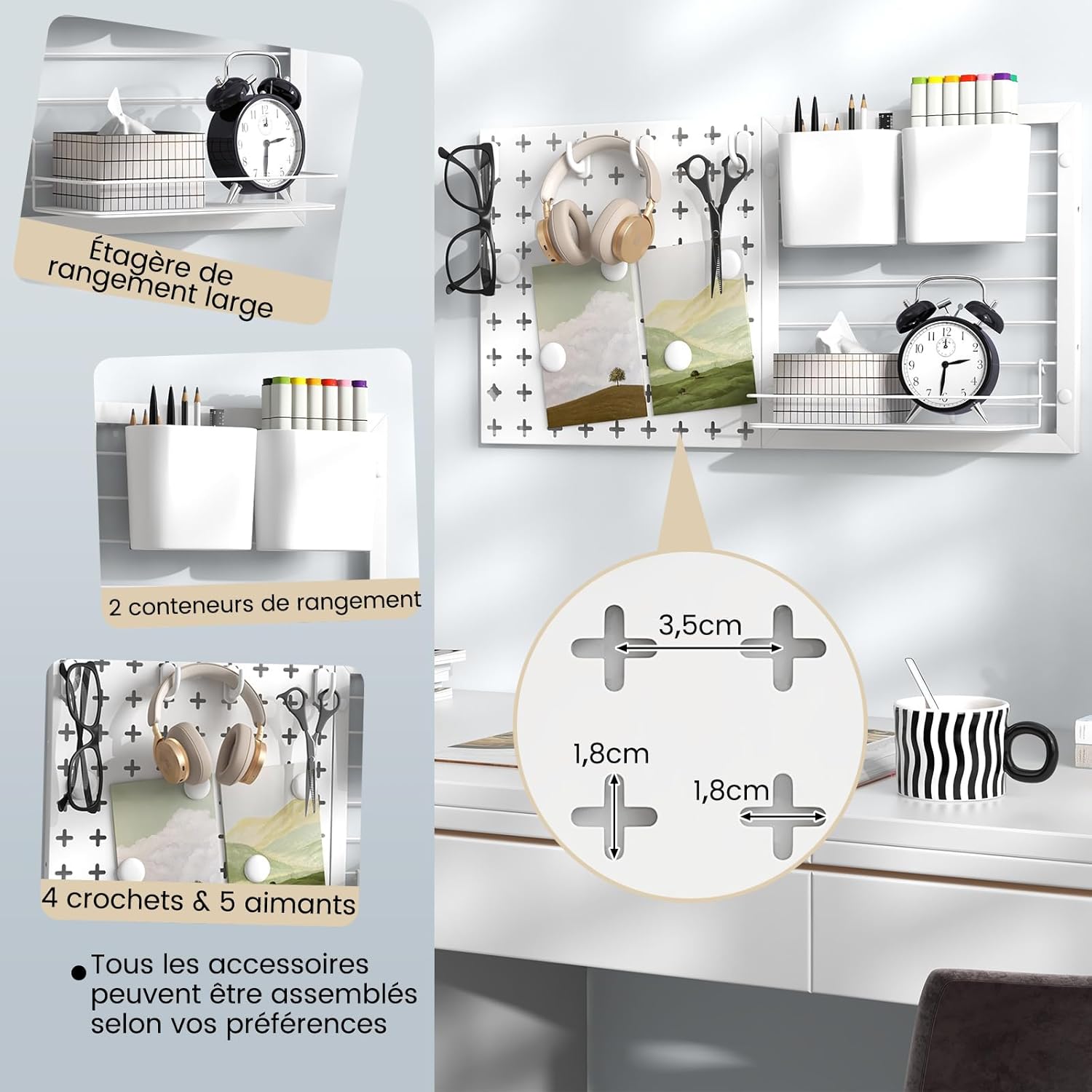 Kit d'organisation murale combinée de panneaux perforés, 2 panneaux perforés, aimants, crochets,blanc