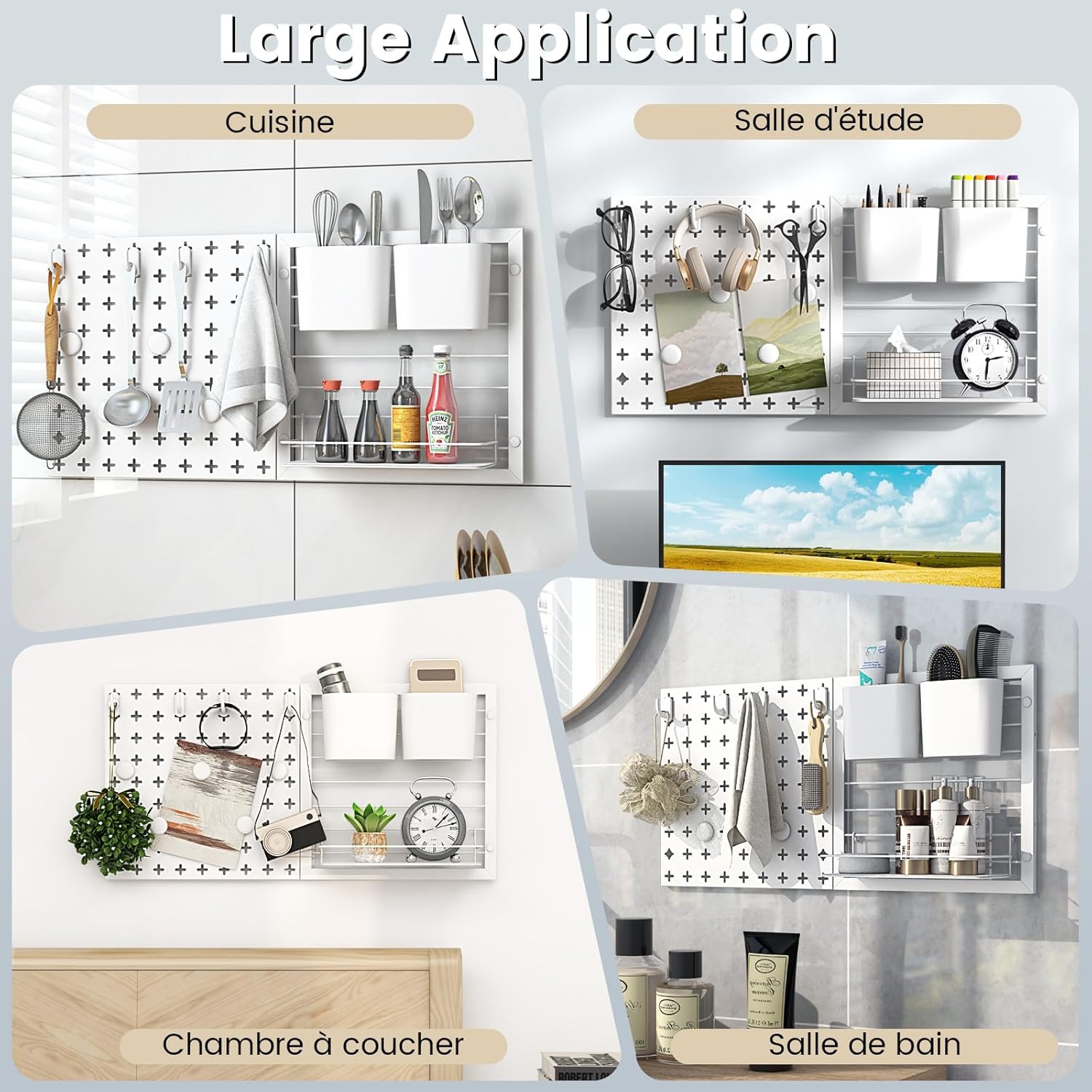 - Diverses options de rangement : L'ensemble mural est livré avec 2 panneaux perforés, 5 aimants, 4 crochets, 2 conteneurs et 1 étagère. Par conséquent, il permet d’utiliser pleinement l’espace mural pour offrir différentes options de stockage et d’affichage.