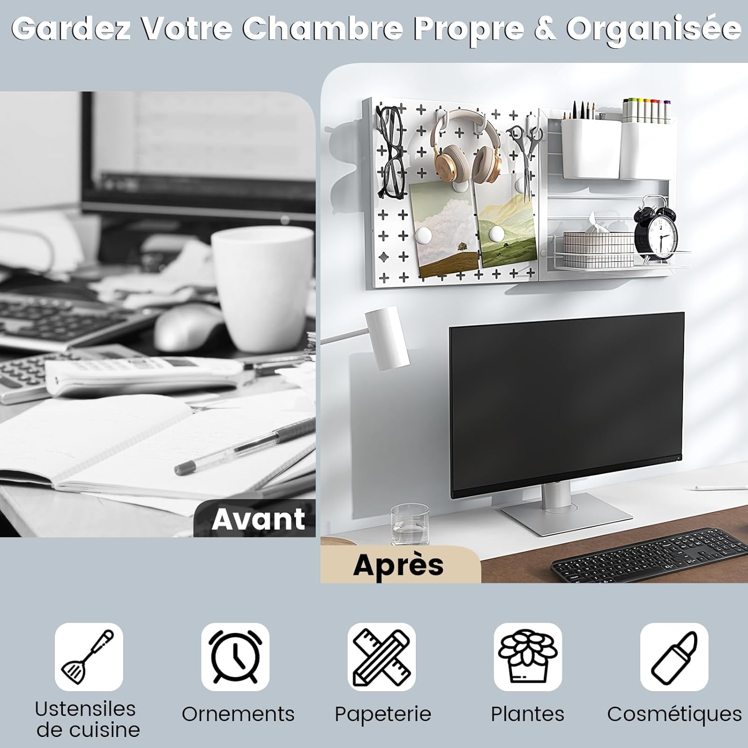- Large gamme d'utilisation : Avec une apparence élégante et polyvalente, le kit combiné de panneaux perforés s'adapte bien à différents styles de maison. C'est un complément parfait au salon, à la chambre, au bureau, à la salle de bain.