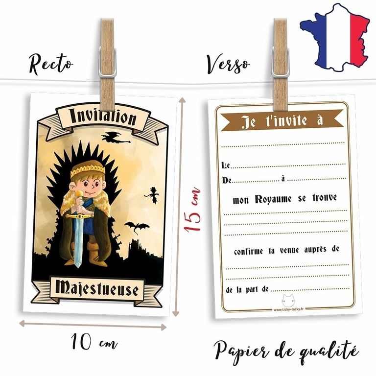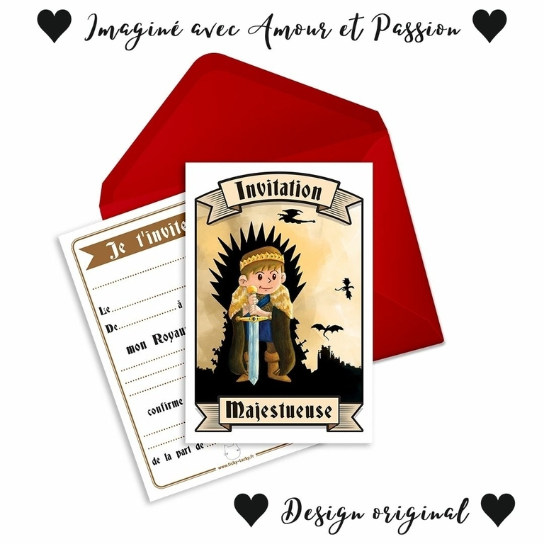 FÊTER SON ANNIVERSAIRE commence d'abord par préparer ses invitations d'anniversaire pour ses copains et ses copines ! Quelle joie et quelle fierté pour l'enfant de participer à la préparation de sa fête d'anniversaire sur le thème de la conquête spatiale ! GRÂCE AUX jolies cartes illustrées par Mr Ticky-Tacky, l'enfant peut écrire à ses amis pour les inviter à sa fête d'anniversaire sur le thème des chevaliers, des princes et des rois ! Pour les parents fans de Game Of Thrones, avez-vous vu notre petit clin d'oeil Geek ! CHAQUE CARTE est imprimée recto/verso, le recto pour annoncer le thème de sa fête d'anniversaire et le verso pour écrire à ses amis. Chaque carte est accompagnée de sa super enveloppe colorée. Chaque pack contient 6 cartes d'invitation et 6 enveloppes de couleur. COCORICOOO ! Nos créations sont 100% françaises ! Nous sélectionnons avec beaucoup de soin nos différents partenaires. Pour le conditionnement de nos produits, nous travaillons avec une entreprise adaptée qui a pour mission l’insertion professionnelle et sociale de travailleurs handicapés. IMAGINÉS avec Amour, Passion et Agréés par nos 3 enfants ! Imaginées, pensées et conçues pour apporter le plein de joie !
