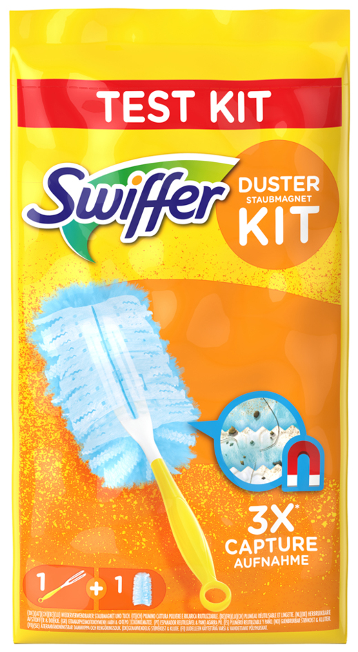 Attrape avec ses plumeaux poussière, saleté et cheveux de toutes les surfaces et les retient solidement Contrairement aux plumeaux courants qui viennent seulement remuer la poussière, le plumeau-magnétique Swiffer absorbe trois fois plus de poussière Le manche flexible et les fibres permettent un nettoyage facile, particulièrement dans les endroits à accès difficile comme par ex. jalousies, étagères de livres et lampes Les décorations et les meubles ne sont pas abîmés grâce aux fibres douces Contenu du kit de démarrage : 1 manche et 1 plumeau
