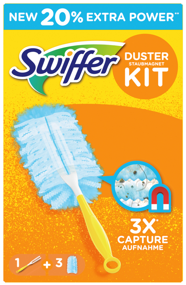 Attrape avec ses plumeaux poussière, saleté et cheveux de toutes les surfaces et les retient solidement Contrairement aux plumeaux courants qui viennent seulement remuer la poussière, le plumeau-magnétique Swiffer absorbe trois fois plus de poussière Le manche flexible et les fibres permettent un nettoyage facile, particulièrement dans les endroits à accès difficile comme par ex. jalousies, étagères de livres et lampes Les décorations et les meubles ne sont pas abîmés grâce aux fibres douces Contenu du kit de démarrage : 1 manche et 3 plumeaux