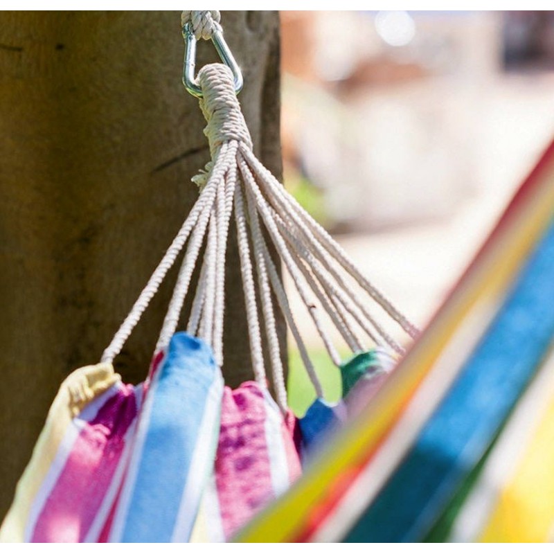 Kit de fixation pour votre hamac contenant 2 cordes en coton et polyester et 2 mousquetons en acier traité époxy pour la résistance à la rouille. Longueur des cordes : 300 cm .Mousqueton : 10 cm. Poids - 1.5kg