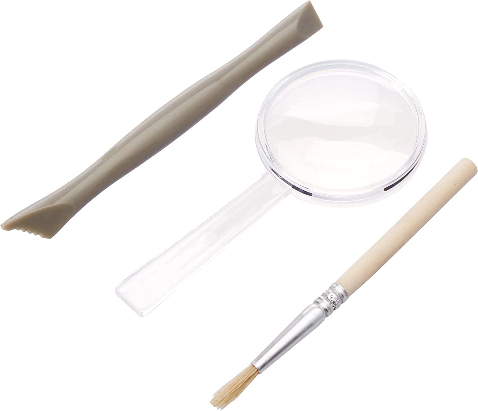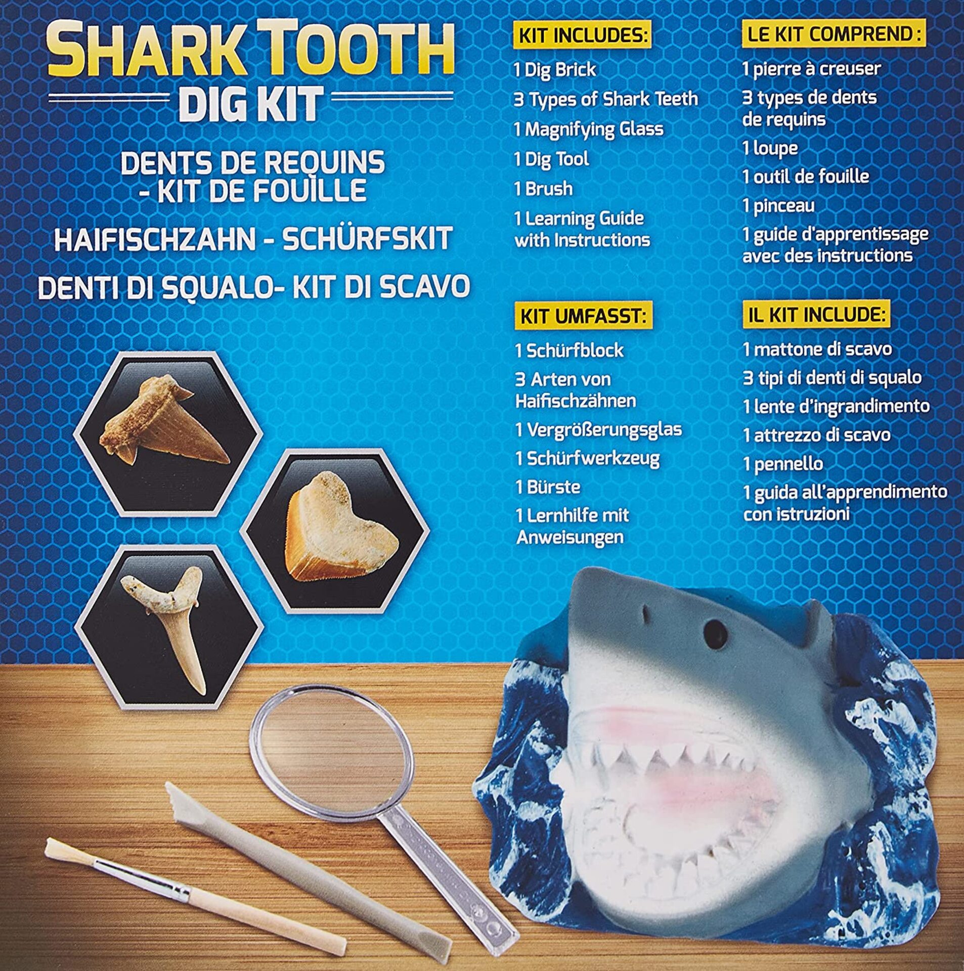 Ce kit permet de déterrer et de découvrir de véritables dents provenant de 3 différentes espèces de requins. Il comprend : une pierre à creuser avec 3 dents de requin fossilisées, différents outils, un guide d'apprentissage et une loupe.