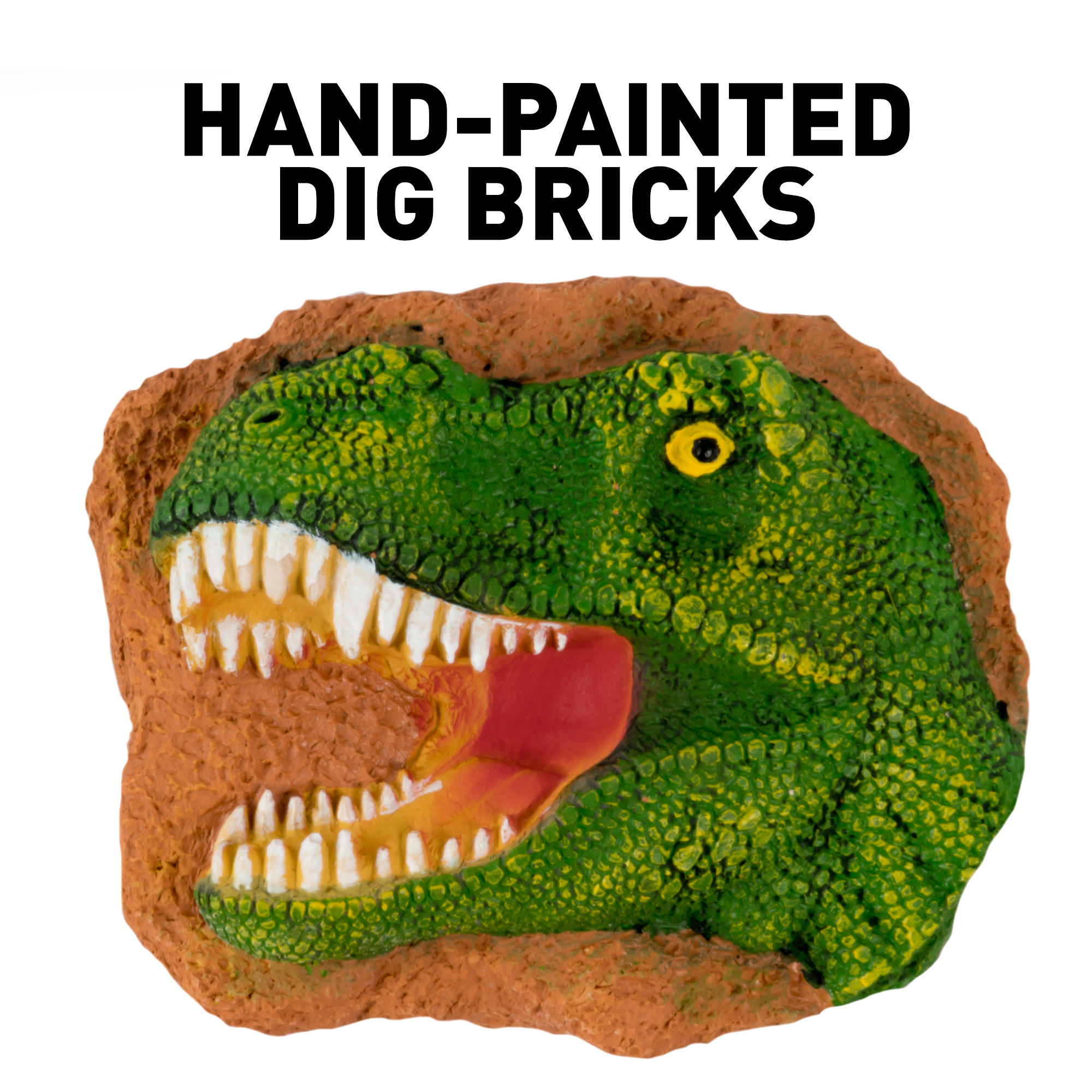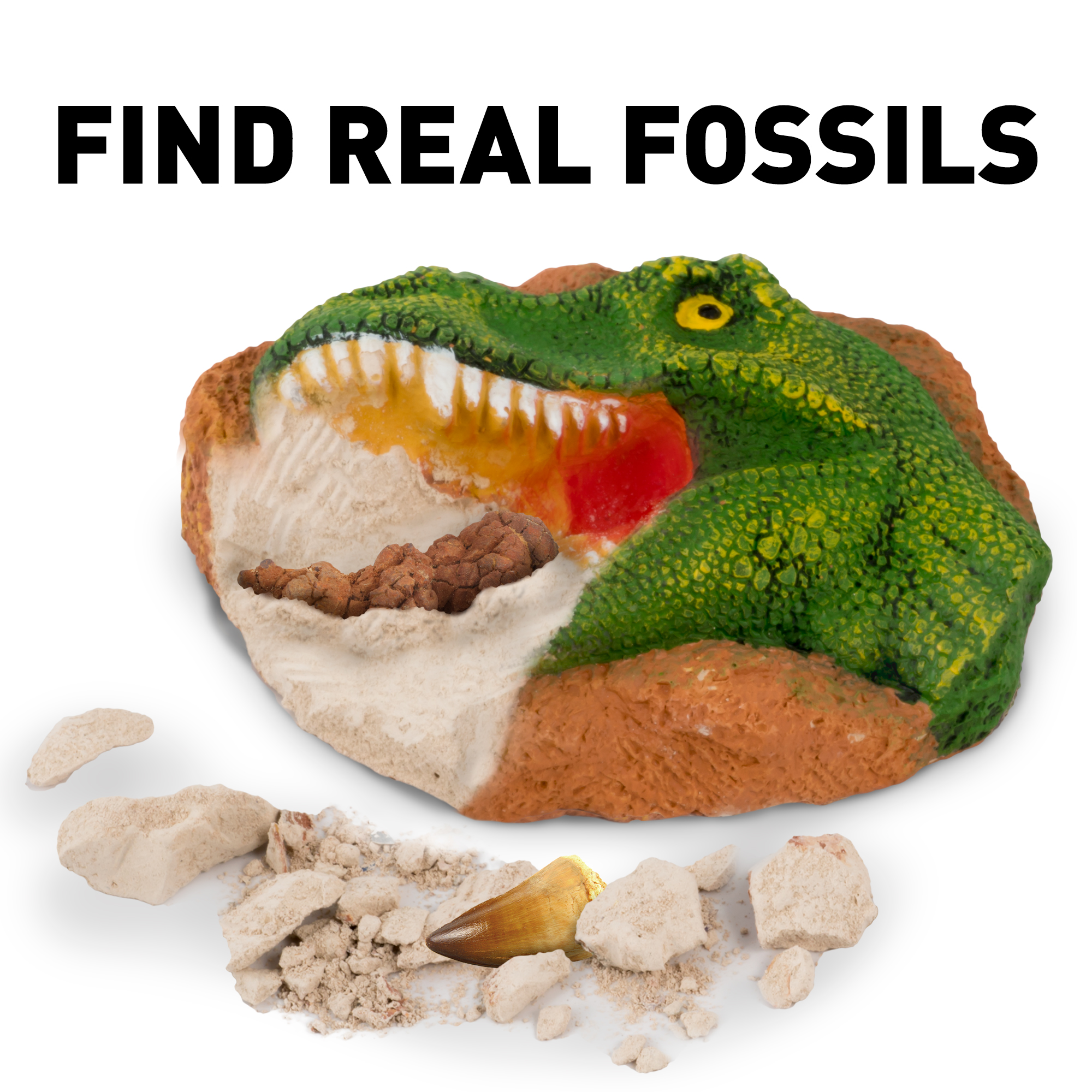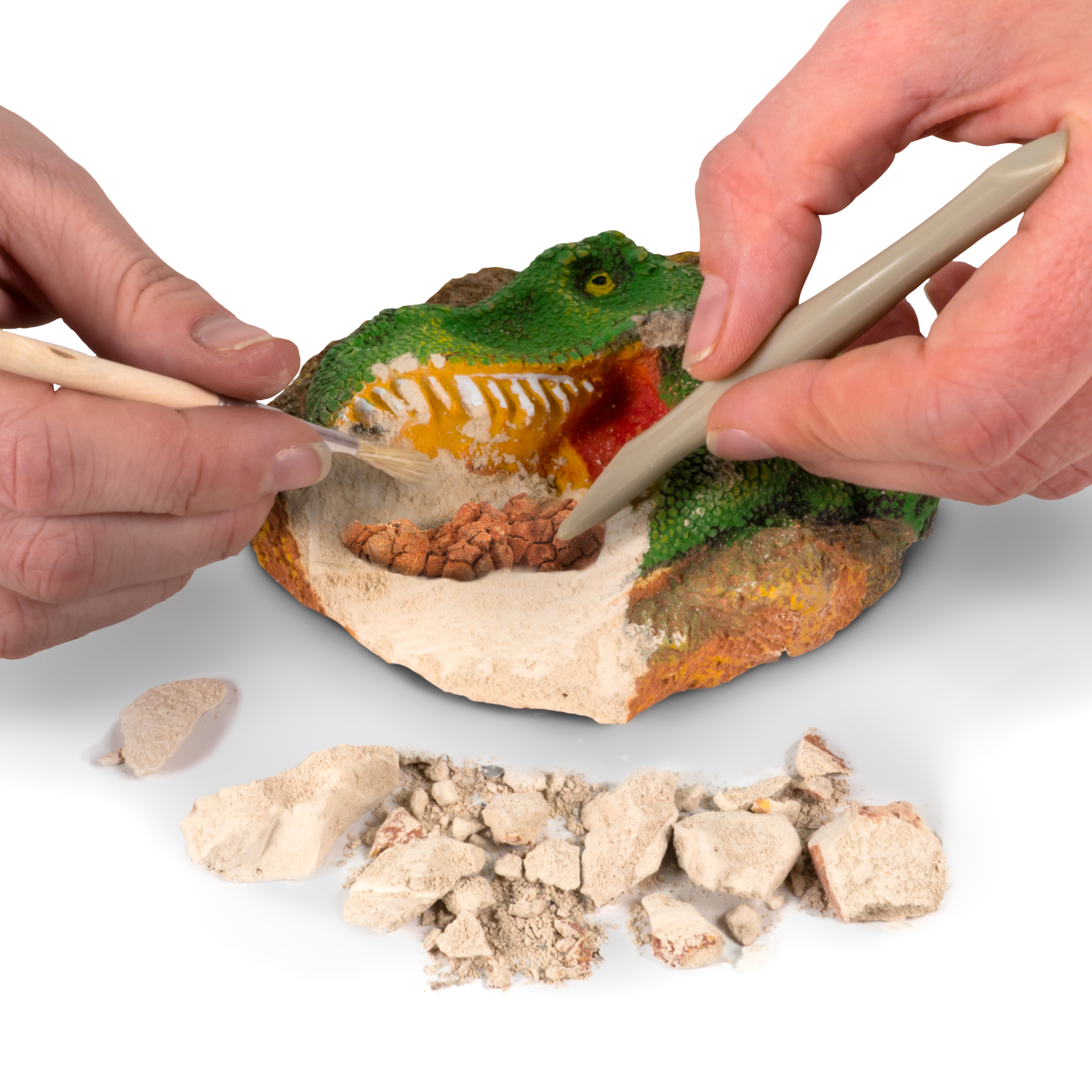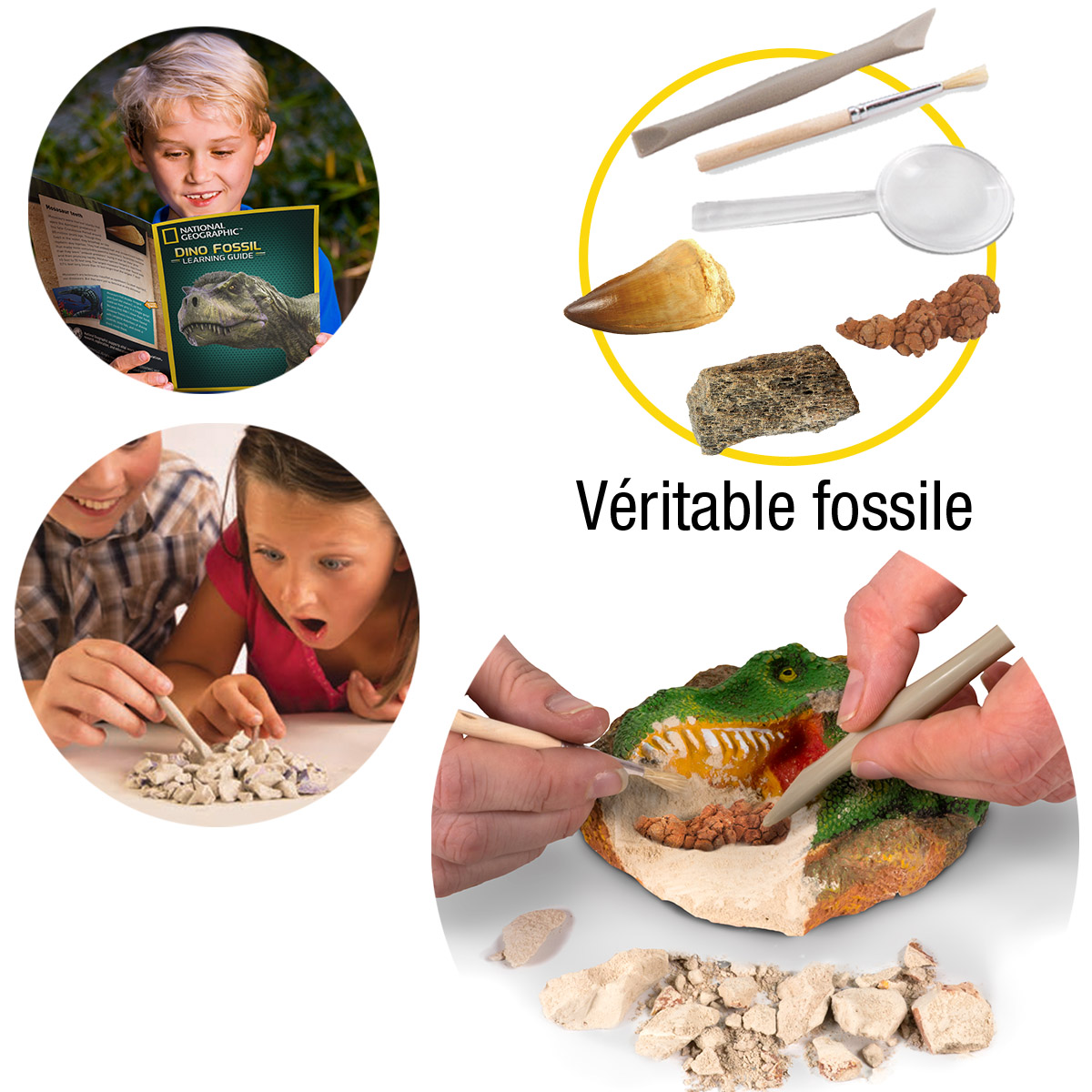 Ce kit permet de déterrer et de découvrir de véritables fossiles de dinosaure. Il comprend : une pierre à creuser avec 3 fossiles (un morceau d'os, une dent et un excrément), différents outils, un guide d'apprentissage et une loupe.