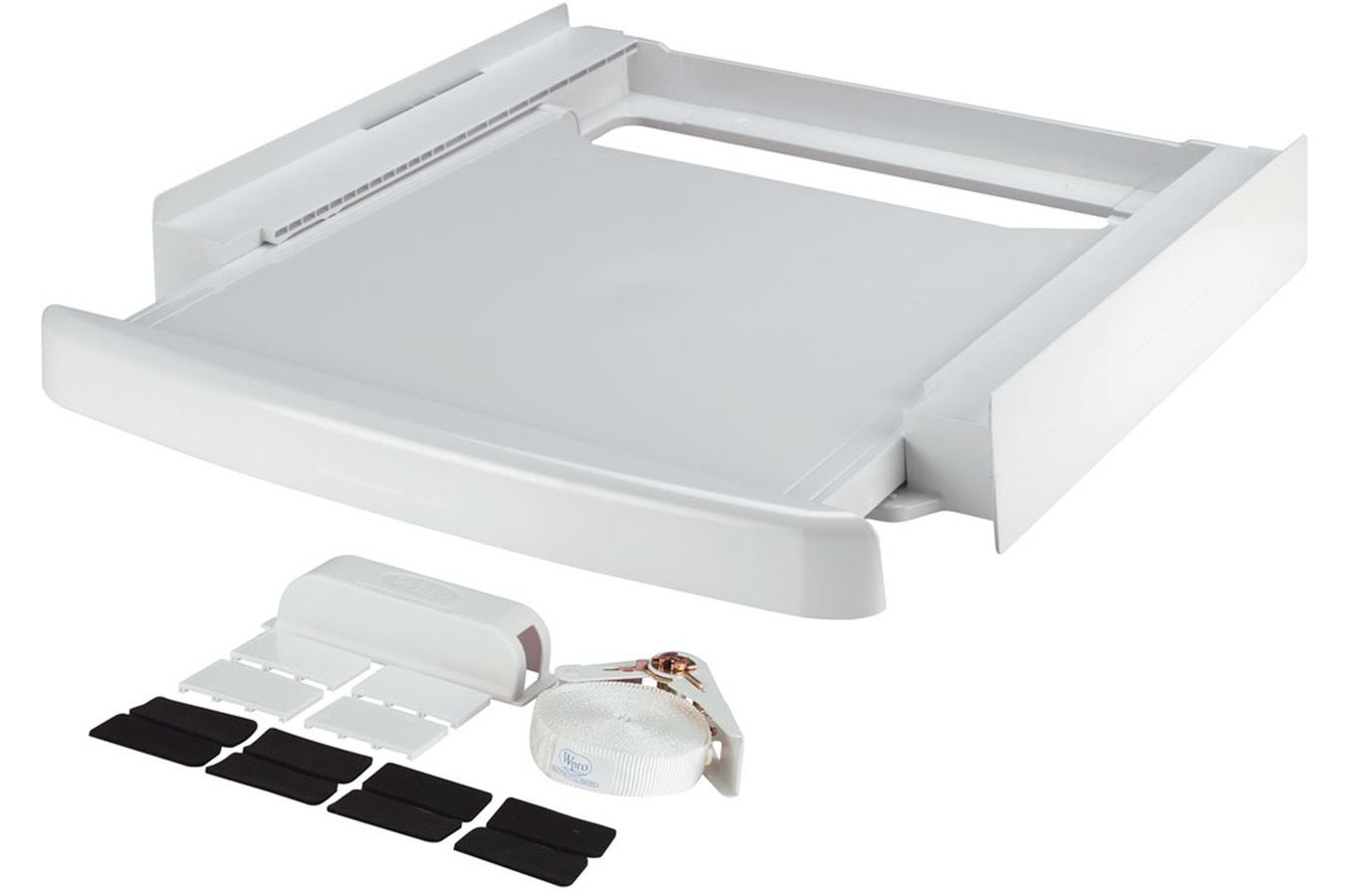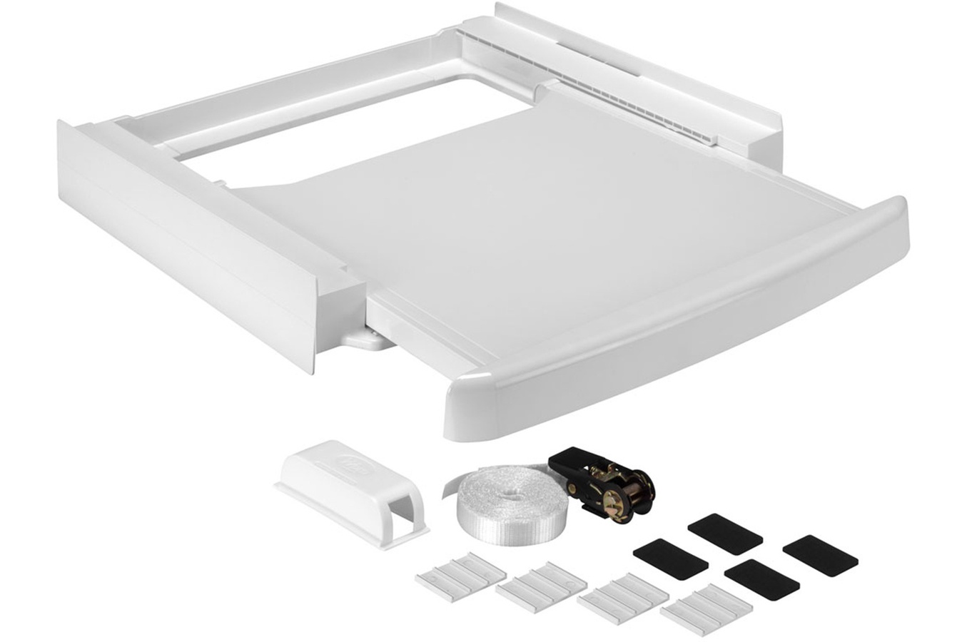 sks101 - kit de superposition 60cm blanc avec tablette - Kit de superposition WPRO SKS101.La solution idéale pour gagner de la place en toute sécurité.Il permet de stabiliser le sèche-linge sur le lave-linge grâce à son système de fixation avec sangle équipée du système Safe-in-Lock.Sa tablette coulissante (10 kg maxi) vous offre un plan de travail supplémentaire pour charger, décharger et plier le linge sans se baisser.