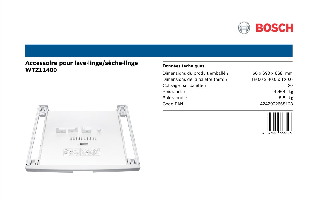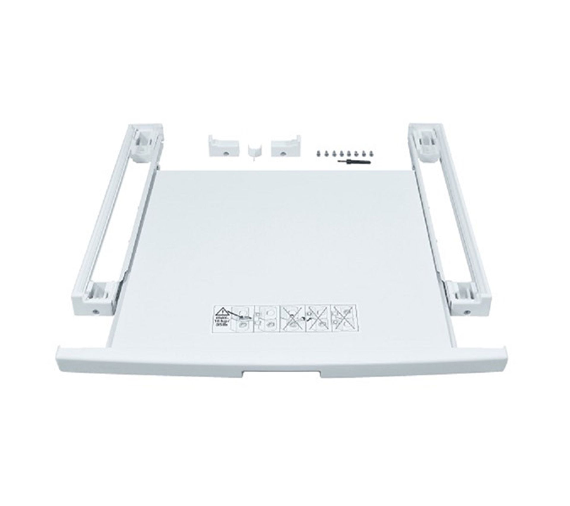 Plus produit Permet d'empiler lave-linge et sèche-linge en colonne, tablette coulissante pour faciliter chargement/déchargement, conception robuste pour stabilité, inclut visserie et pictogrammes d'installation
