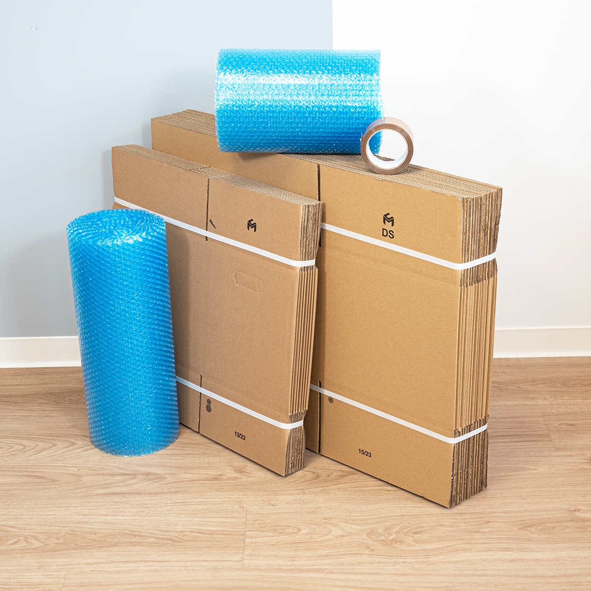Autre kit avec les produits de base que sont les cartons, l'adhésif et le papier bulle pour bien réussir son déménagement. Ce kit est composé de : - 15 cartons standards 55x35x30 cm - 8 cartons pour livres 35x27,5x30 cm - 1 rouleau de film bulle 0,5 x 10 m - 1 rouleau de film bulle 0,33 x 10 m - 1 adhésif 100m havane