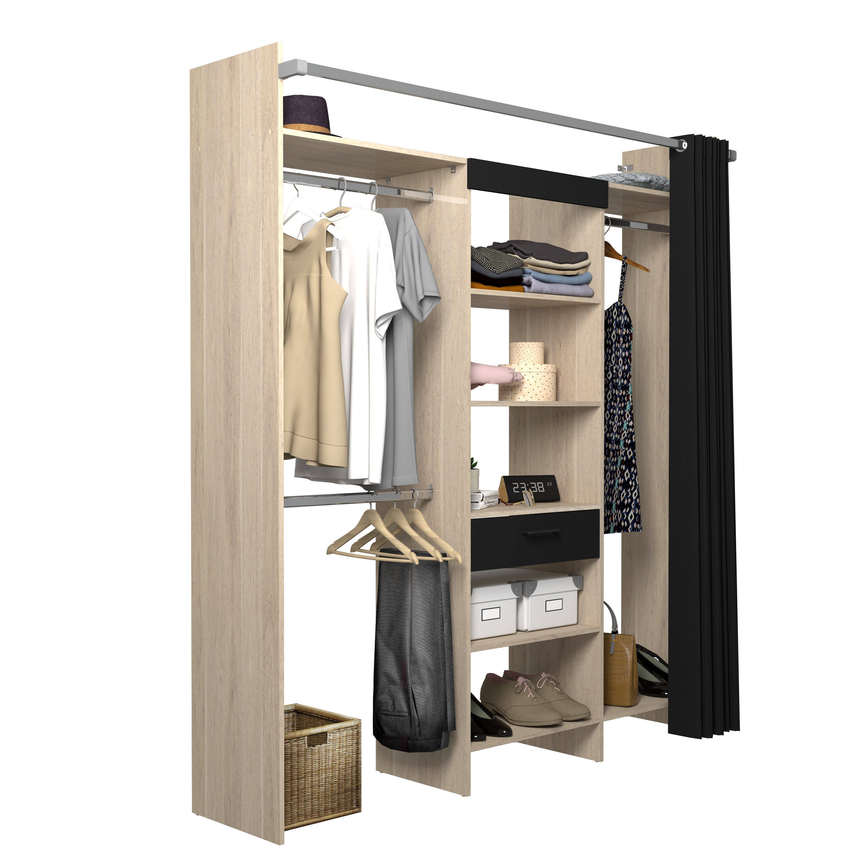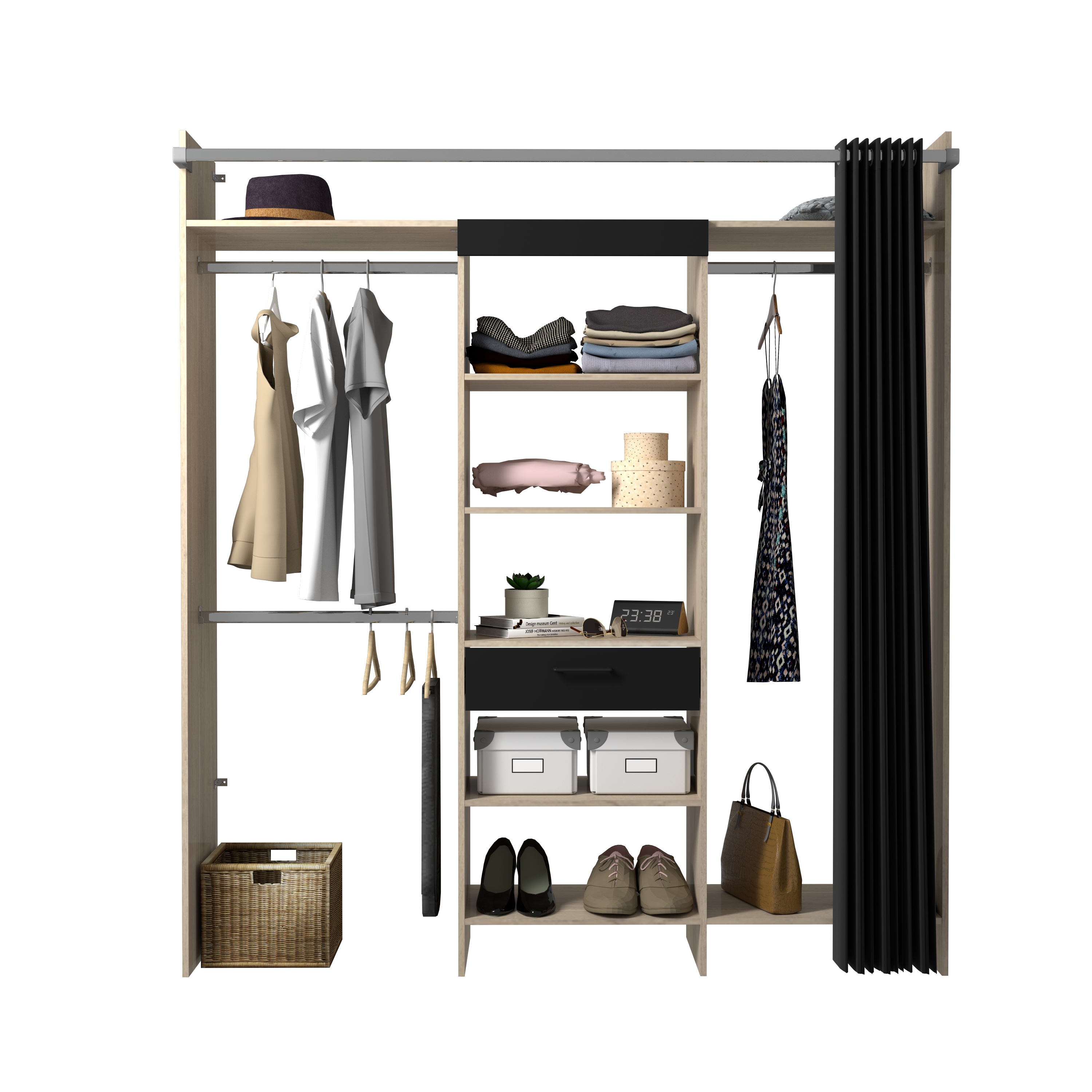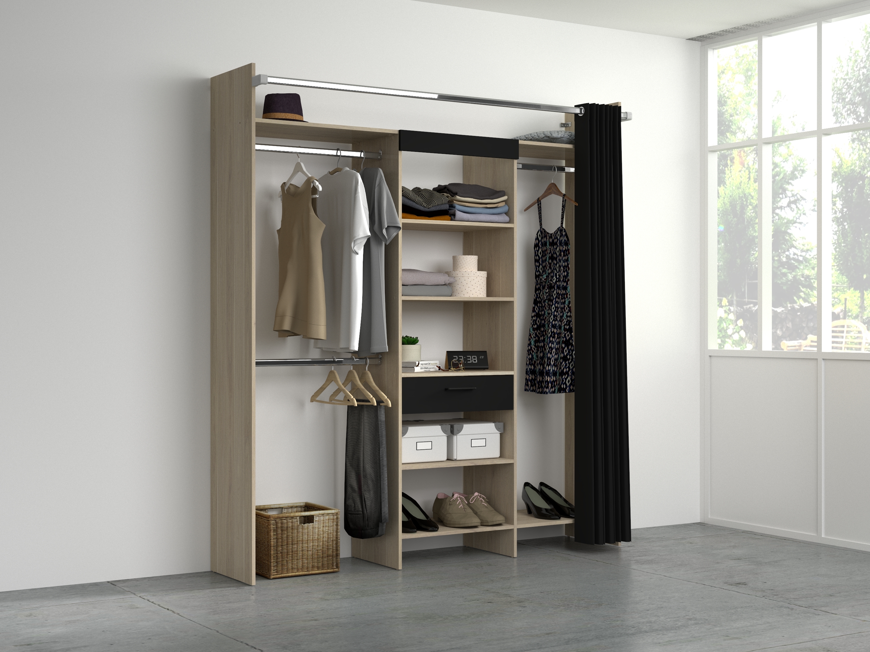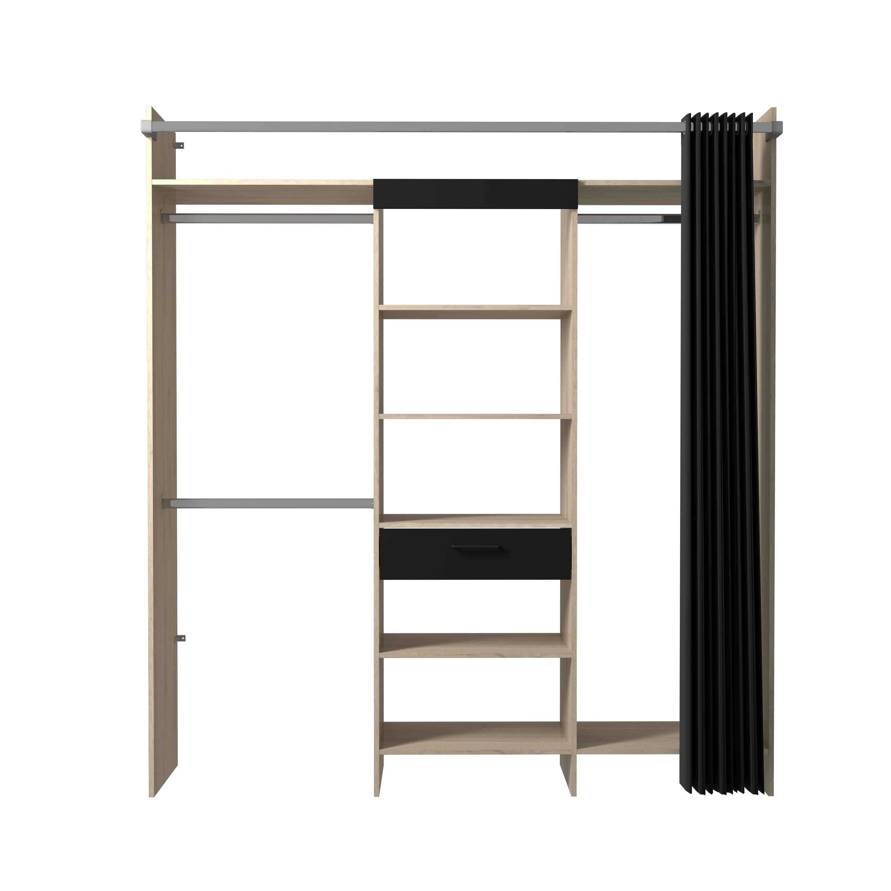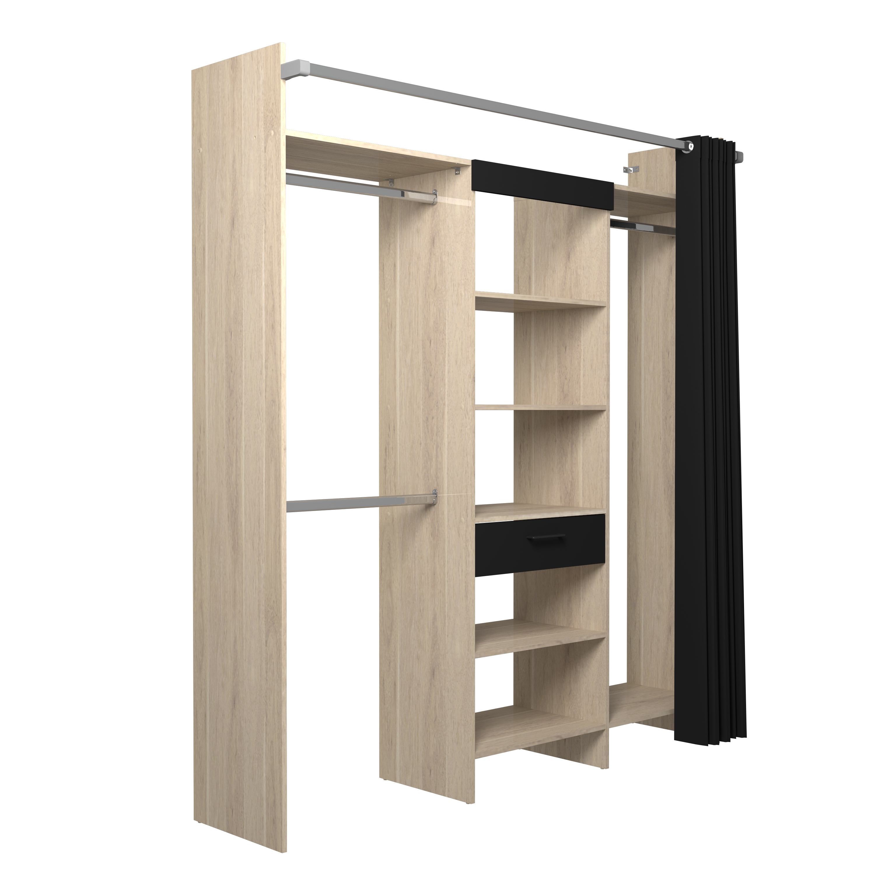 Comprend: 1 colonne de 60 cm avec 1 tiroir, 1 bandeau noir, 5 tablettes, 1 tablette hivernage, 1 double penderie avec 3 barres de penderie et 1 tablette, 1 rideau noir avec tube en acier. Ajustable en largeur par redécoupe (tablettes et barres).