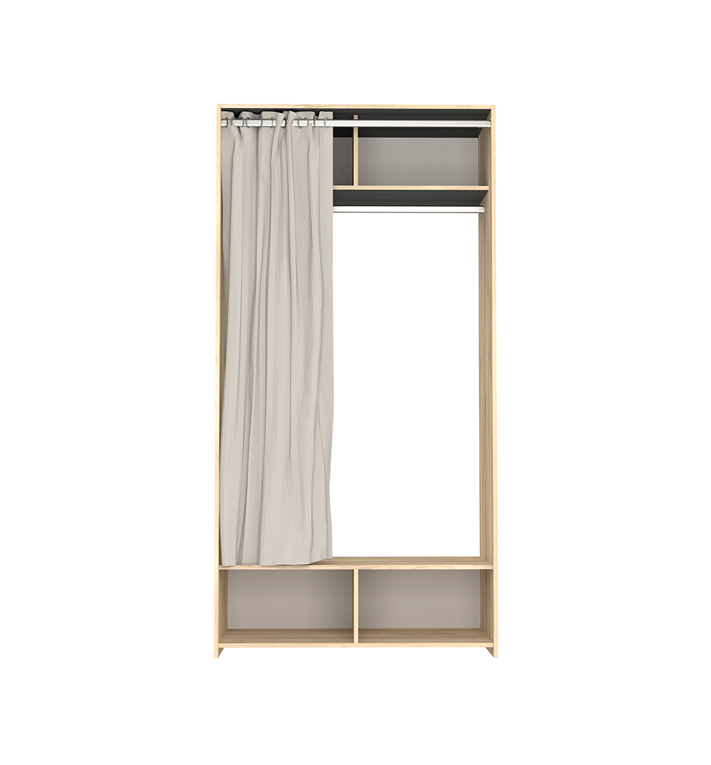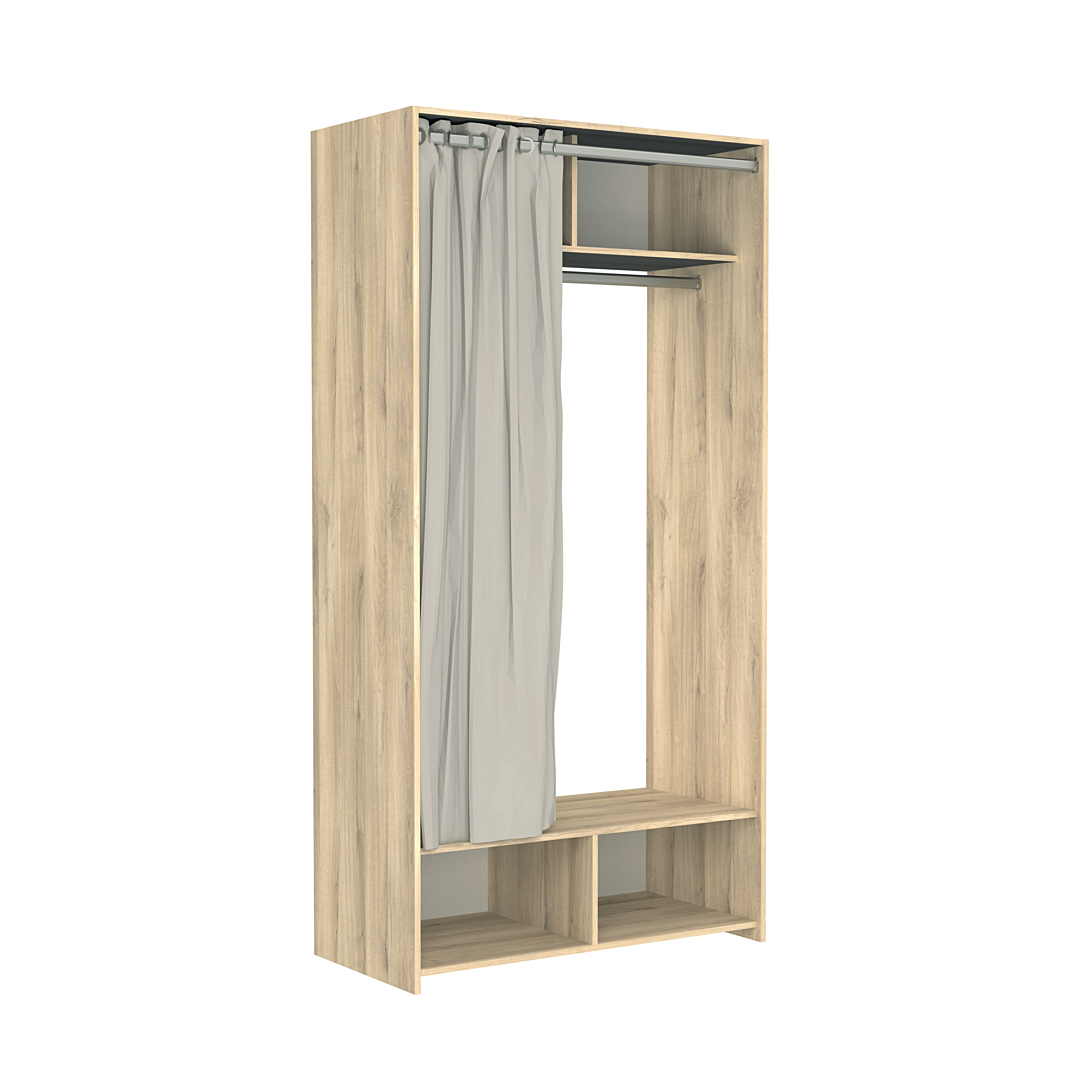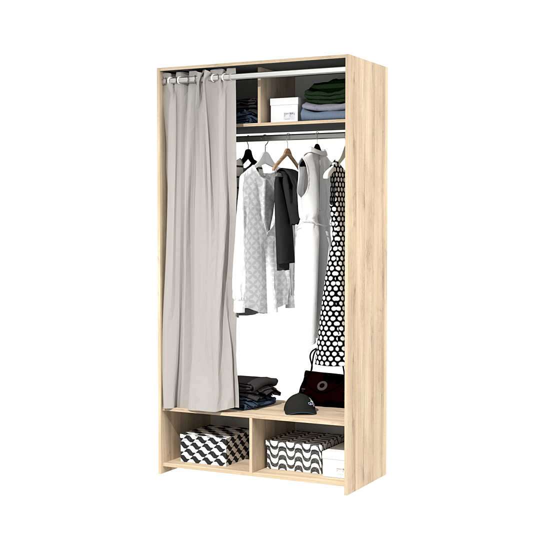 Structure en panneau épaisseur 15 mm 2 faces décor chêne, chants assortis > espace penderie avec barre H.168 cm + espace de rangement haut 2 cases avec dos + espace de rangement bas ouvert 2 cases avec dos + kit rideau > dimensions L.103XP.50XH.203 cm > garantie 2 ans > fabrication française (Creuse 23) > certifié PEFC