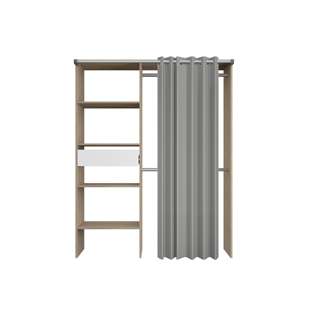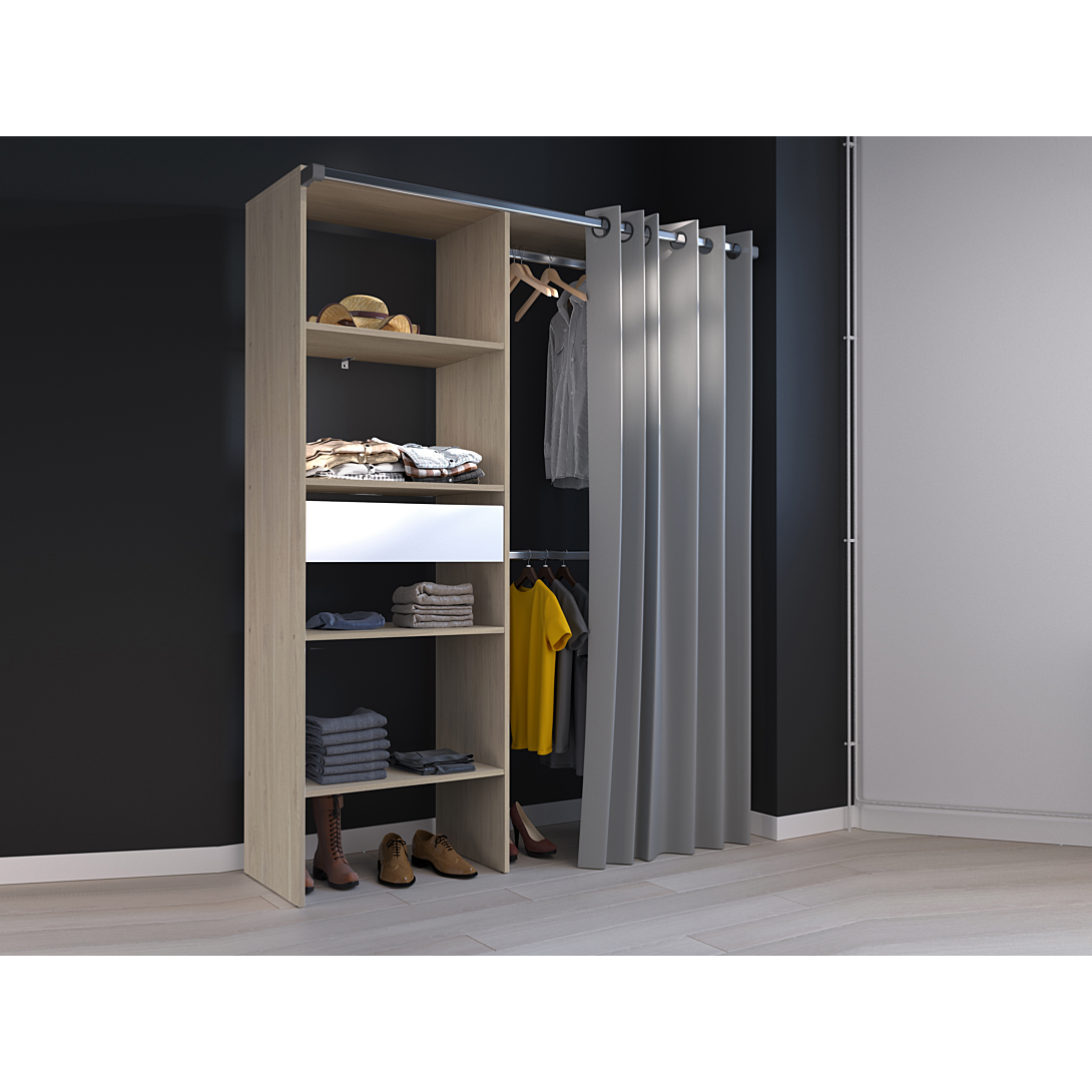 Colonne avec 4 tablettes larges et un tiroir blanc de 60 cm sur coulisses à billes, 2 barres de penderie pour parties haute et basse • Rideau gris de 210cm en polyester sur 12 oeillets Transformez votre espace de rangement avec le Kit Dressing Complet GARY ! Offrez-vous l'organisation parfaite avec un aménagement à rideau compact. Découvrez une nouvelle dimension de praticité et de style pour votre quotidien. Plongez dans l'esthétique chaleureux du Chêne Dakota et du Blanc avec ce kit dressing. Que ce soit dans une chambre à coucher, une suite parentale, ou même dans un dressing indépendant, Gary s'intègre harmonieusement, ajoutant une élégance intemporelle à votre intérieur. Que vous ayez des vêtements longs ou courts, Gary propose une double penderie astucieuse, vous offrant amplement d'espace pour tous vos vêtements. Gardez votre garde-robe bien ordonnée et à portée de main. Gary intègre une colonne lingère intelligente avec des étagères modulables vous permettant de personnaliser l'espace selon vos besoins, tandis qu'un tiroir spacieux offre une solution organisée pour vos accessoires.