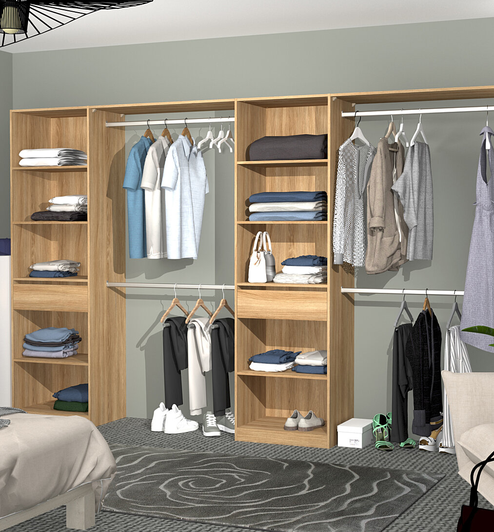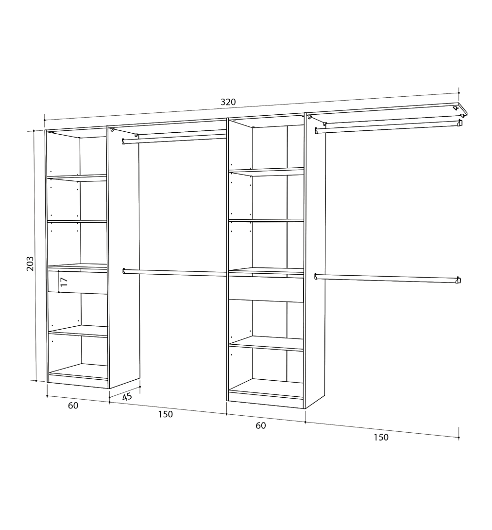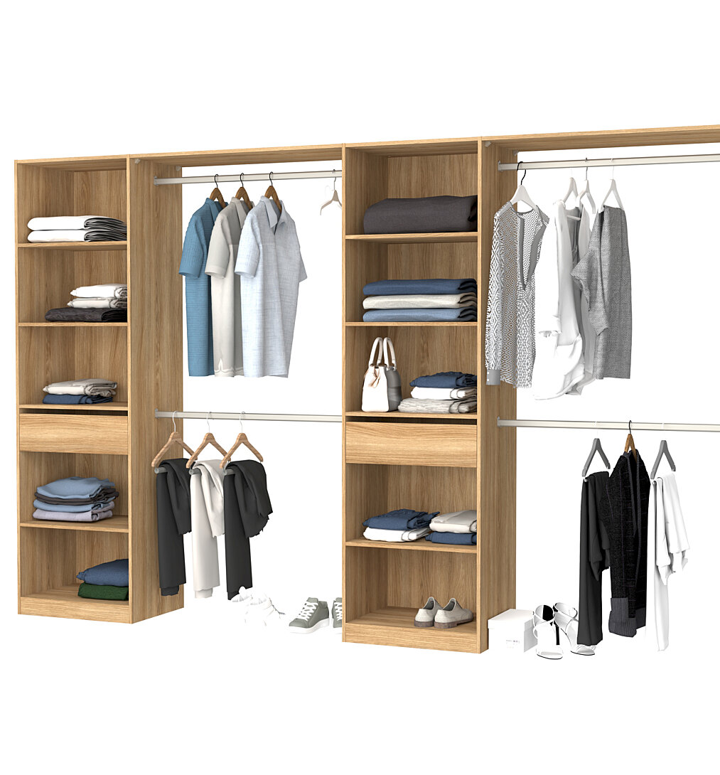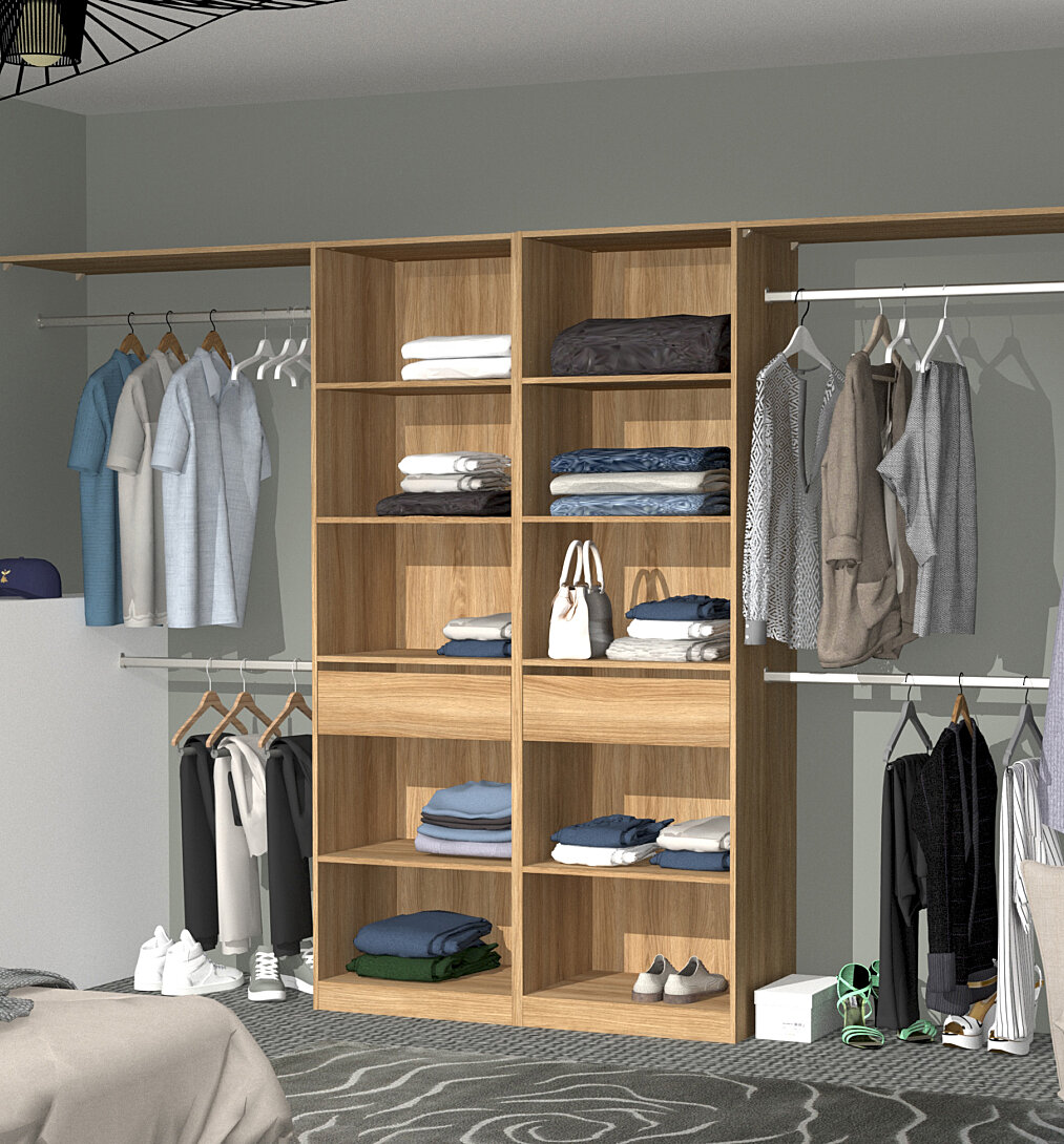 structure en panneau de particules épaisseur 15 mm 2 faces décor chêne clair corvo, chants assortis 2 versions de montage > 2 colonnes de 60 cm avec tiroir sur coulisses à billes/ 4 étagères, un derrière toute hauteur coloris chêne clair corvo et un socle + 4 barres de penderie recoupables + 2 tablettes d'hivernage 100 cm ajustables dim L.320XH.203.P.45 cm fabrication française (Creuse 23) pefc garantie 2 ans