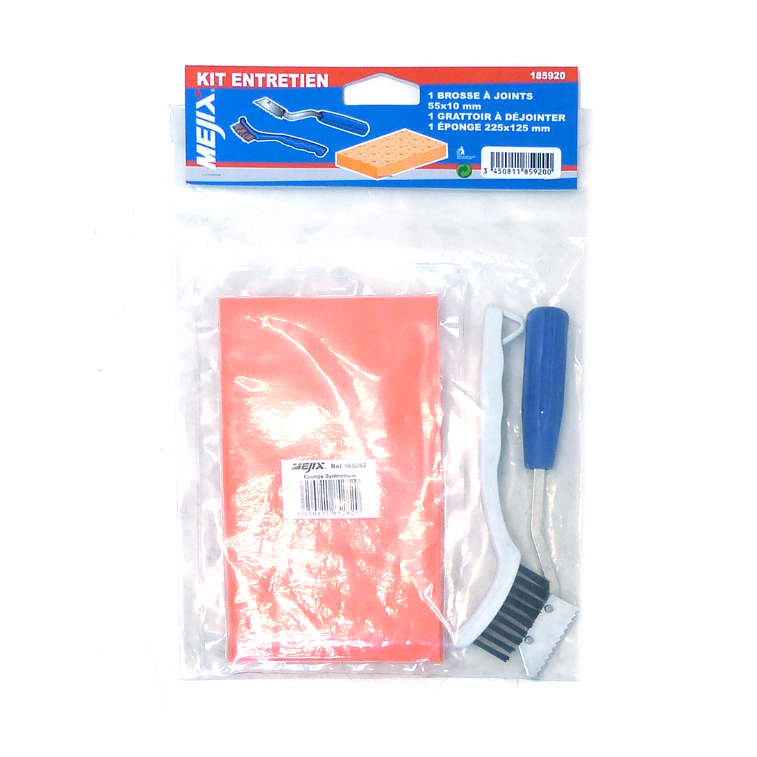 Le kit de nettoyage est spécialement conçu pour entretenir et rénover vos surfaces carrelées. Il contient une brosse à joints pour un nettoyage efficace, un grattoir à déjointer équipé de deux lames pour retirer les joints usés, et une éponge sous vide pour un nettoyage final sans traces. Ce kit est parfait pour redonner vie à vos carrelages et assurer une finition impeccable.