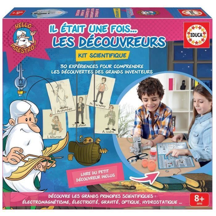 Un coffret d´expériences scientifiques pour comprendre les grands principes derrière les inventions des héros de la série Il était une fois Les Découvreurs * Archimède, Newton, Volta,d’autant de grands découvreurs qui ont été à l’origine d’inventions qui facilitent encore aujourd’hui notre vie quotidienne. Ce coffret d’expériences scientifiques te permet de réaliser des expériences et de percer les secrets de leurs découvertes. * Dans le livret du petit découvreur, Maestro te guide pas à pas pour réaliser les expériences, t´explique quelles inventions ont été permises grâce au principes démontrés et te présente les grands découvreurs.
