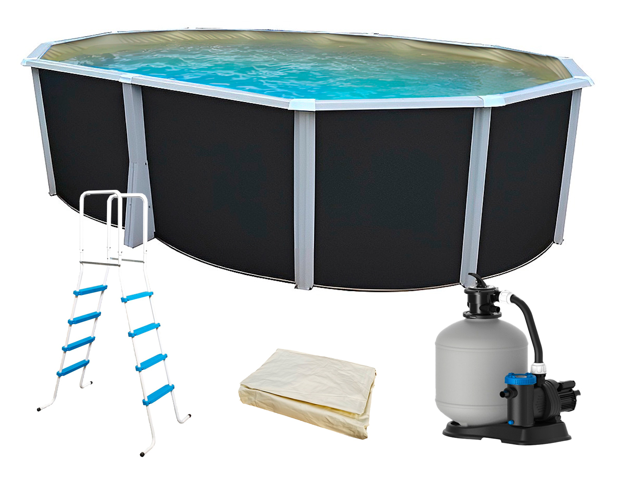 Kit piscine hors-sol Toi ANTHRACITE IBIZA ovale 550X366X132cm. Parois acier laquées couleur anthracite, filtre à sable, liner épaisseur base et paroi de 0,40mm uni beige, margelles blanches en acier laqué, contreforts enterrés, 1 contrefort...