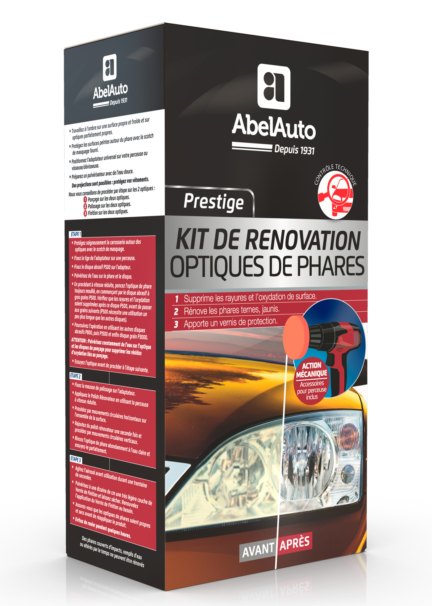 Kit de rénovation optiques de phares AbelAuto Des optiques comme neufs en 3 étapes : - Supprime les rayures et l’oxydation de Surface. - Rénove les phares ternes, jaunis. - Apporte une finition de protection. Ce kit complet contient tous les accessoires et conseils pour réaliser cette rénovation simplement et efficacement sur 2 optiques.
