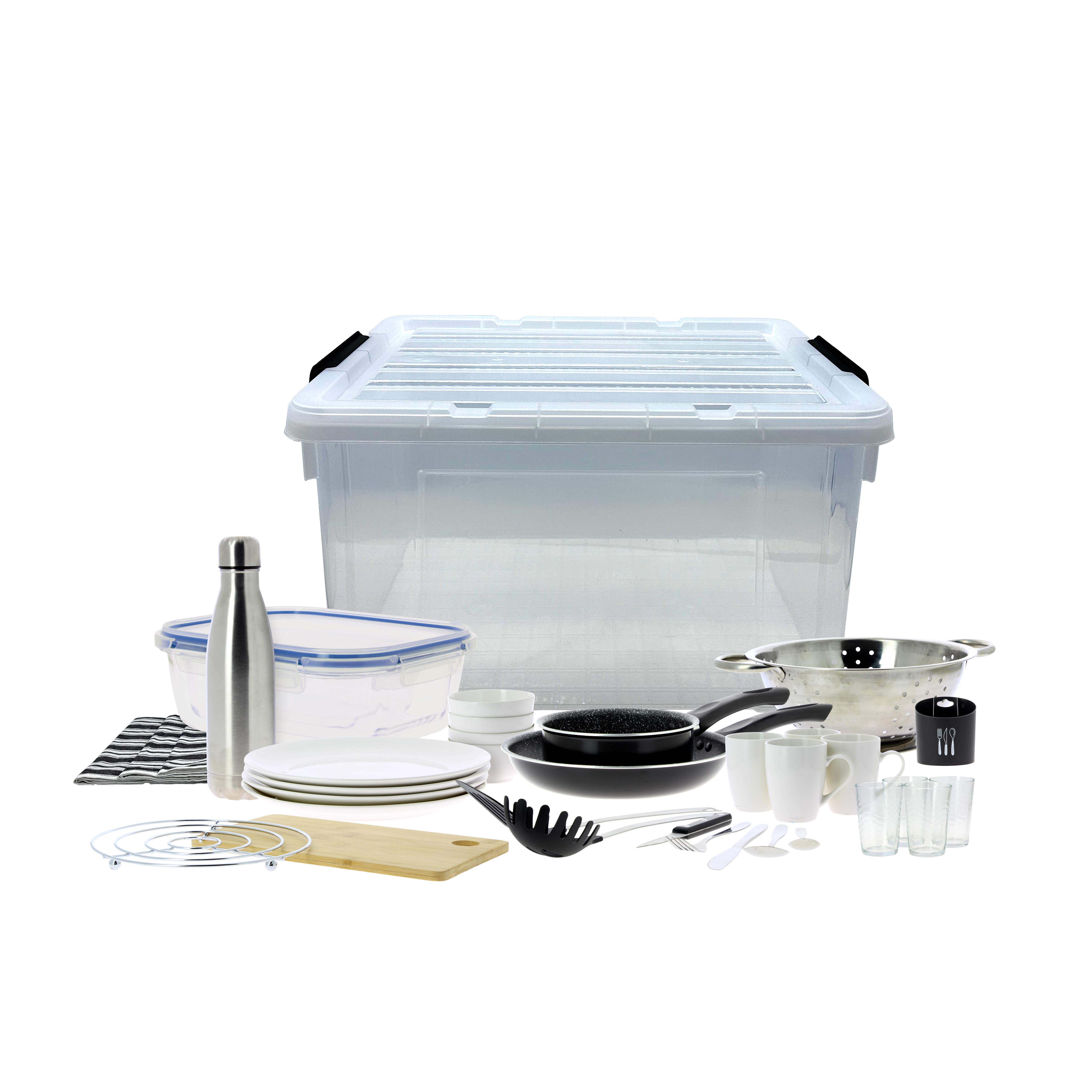 1 boite de rangement 47L + 4 assiettes plates D26.5cm + 4 bols d13cm + 4 mugs 33cl + 4 gobelets FB 21cl + 1 ménagère 16pces + 3 torchons 45x60cm + 1 cuillère à spaghetti + 1 spatule + 1 passoire D21.5cm + 1 dessous de plat + 1 planche à découper + 1 couteau office + 1 bouteille isotherme 50cl + 3 boites de conservation 65-150-240cl + 1 égouttoir à couverts + 1 poêle d24cm + 1 casserole d16cm