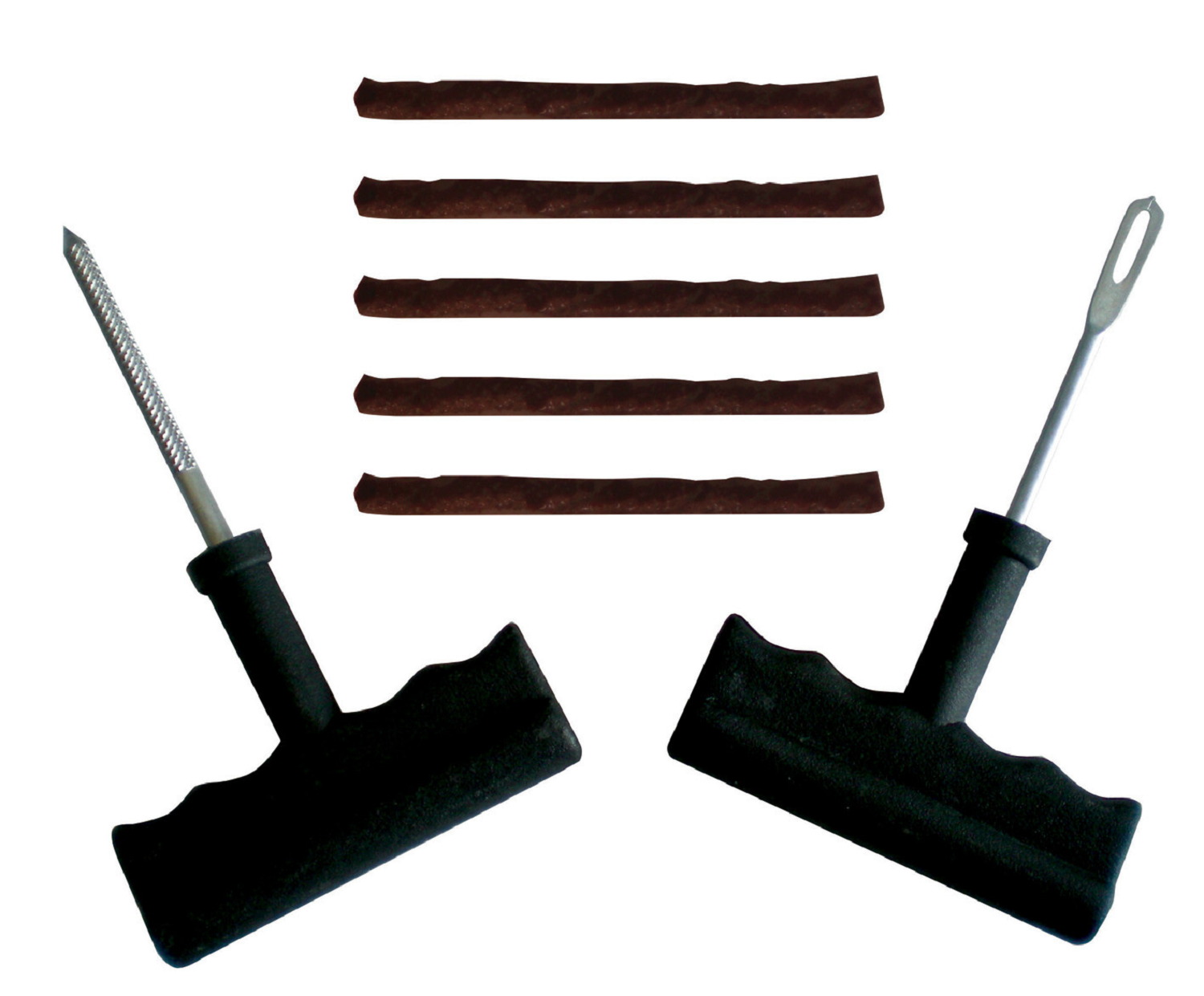 Kit de réparation pneus tubeless, composé de 5 mèches A utiliser uniquement sur la bande de roulement Instructions d'utilisation : Enlever l'objet qui a causé les dommages et gonfler le pneu a la pression de fonctionnement préconisée. Insérer la lime dans le trou pour retirer tous les objets étrangers. Centrer la mèche dans les chas de l'aiguille Pousser l'aiguille avec la mèche dans le trou (dans la même direction que la lime dans l'étape 2) jusqu'à ce qu'environ 1,5 cm de la mèche dépasse du pneu puis tourner l'aiguille d' 1/4 de tour et la retirer délicatement. Couper la surplus de la mèche au plus près du pneu