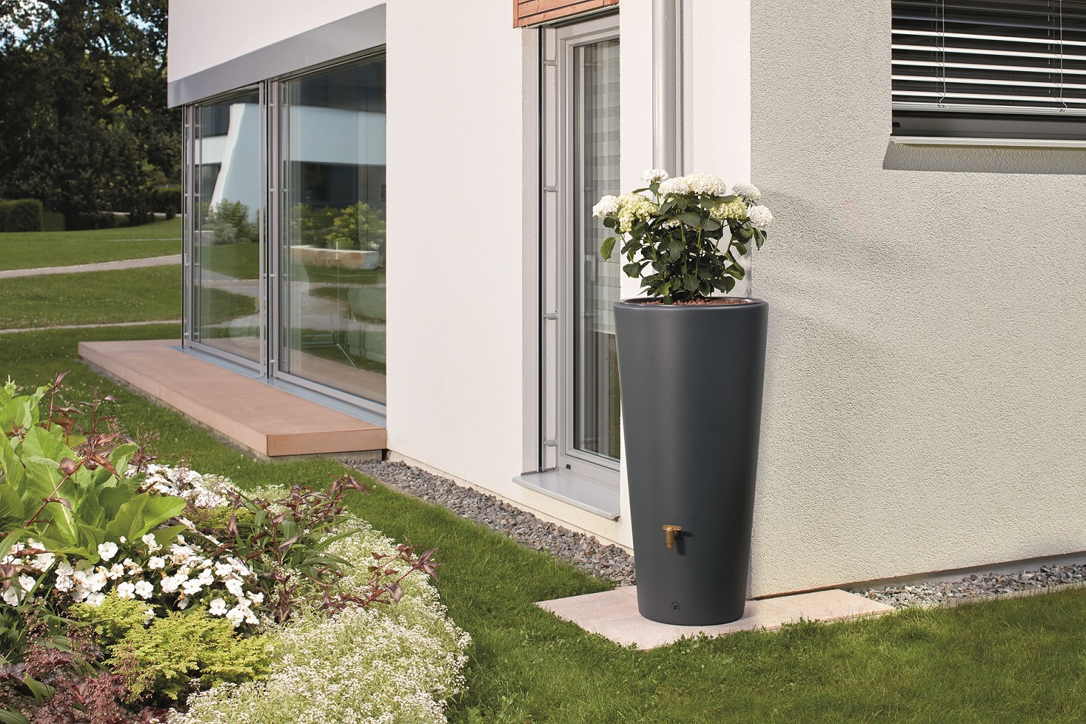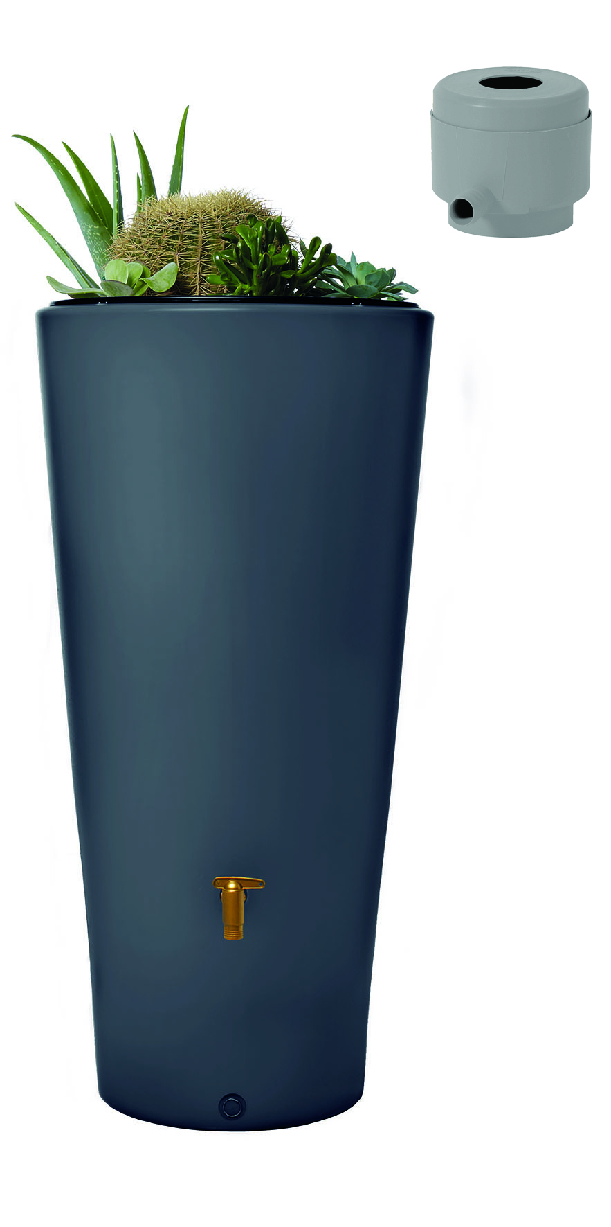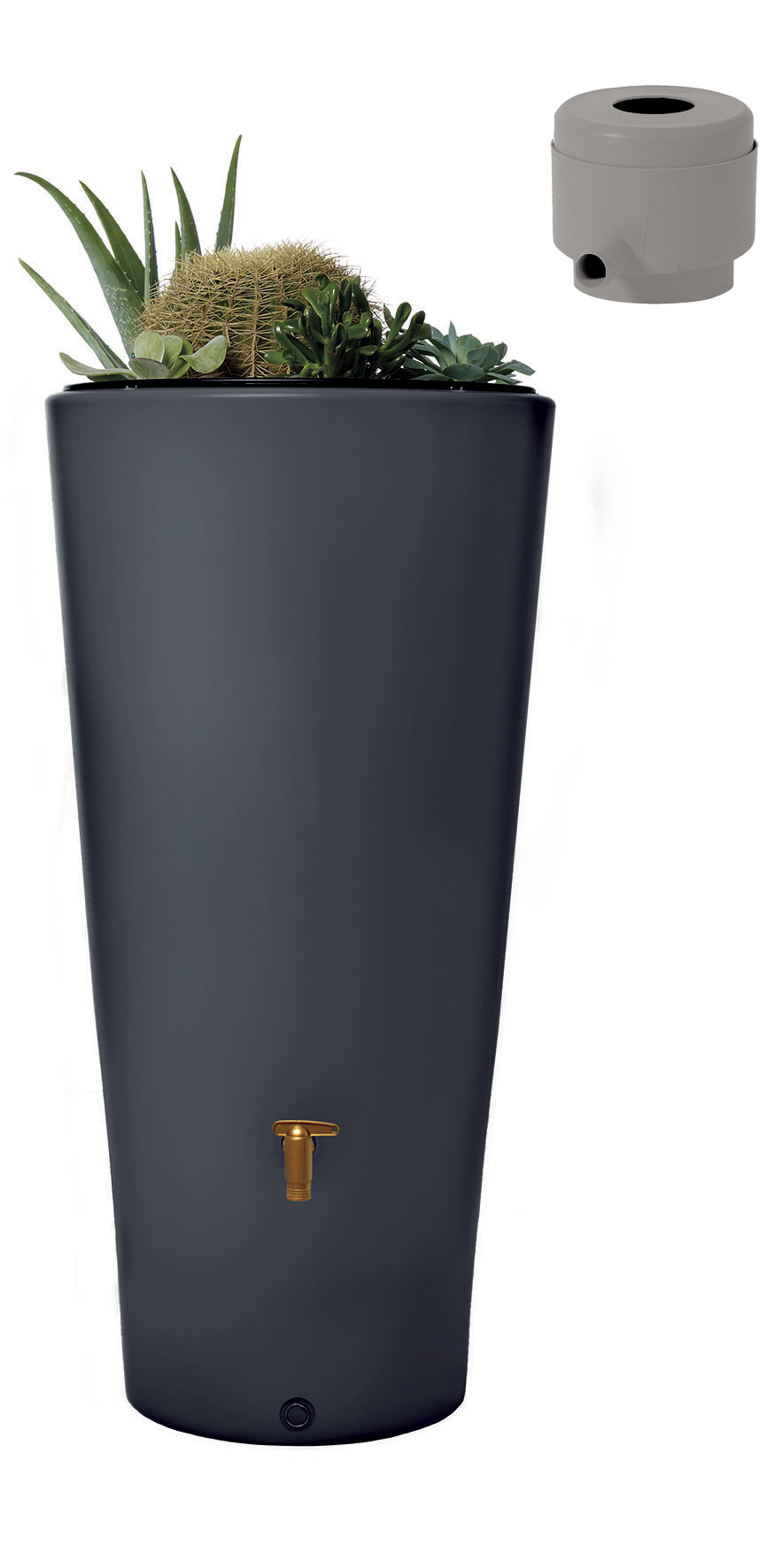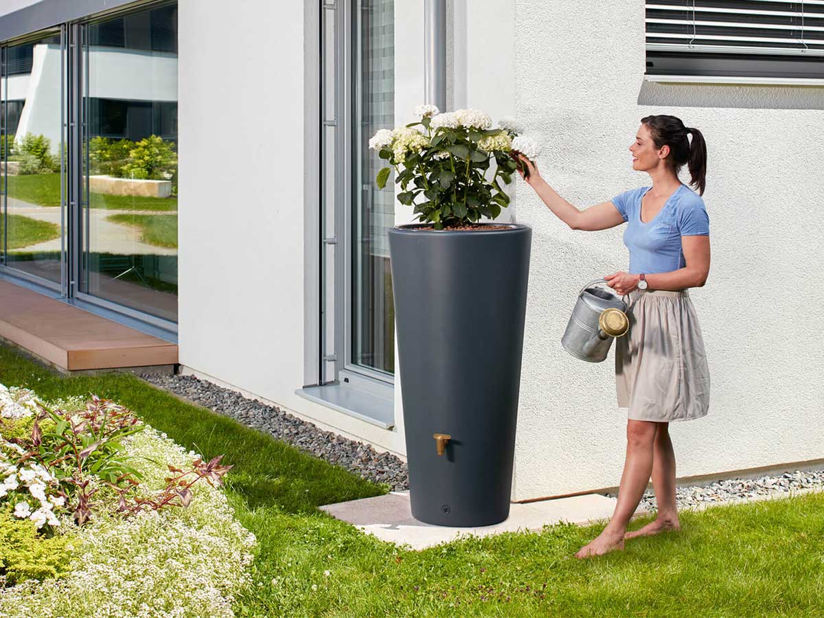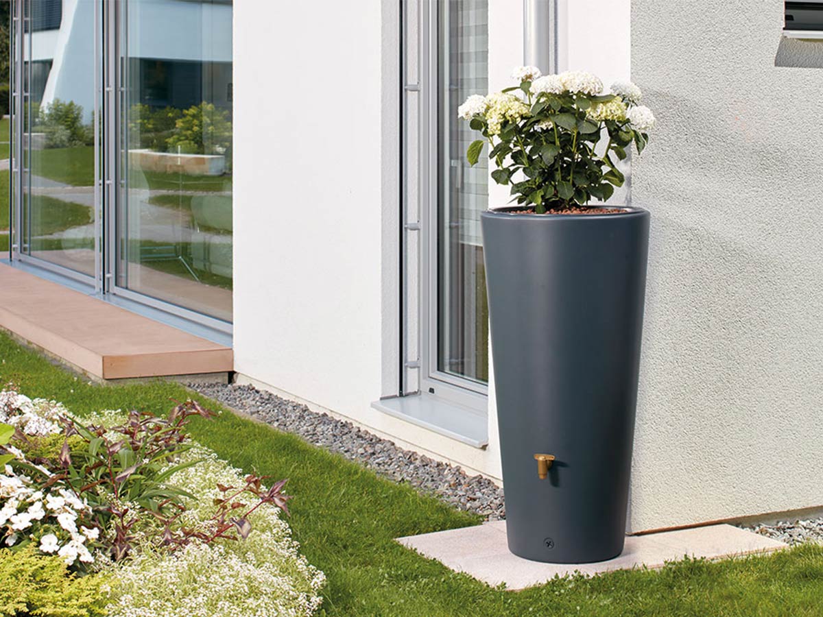 995173 - kit réservoir 2en1 vaso 220l gris graphite - L'aspect moderne et le coloris tendance du réservoir Vaso 2en1 lui permettra de trouver facilement sa place dans votre jardin. Son bac à plantes intégré vous permettra de l'agrémenter d'une touche florale.Produit :- Kit complet prêt à l'emploi.- Réservoir à double fonction : utilisation de l'eau de pluie et décoration grâce à son bac à plantes amovible.- Esthétique et pratique, s'intègre parfaitement dans le jardin.Kit composé de :- Réservoir Vaso 2en1 avec bac à plantes amovible, géotextile, système d'attache murale et joint DN 19/32 (non monté).- Robinet PE imitation laiton.- Collecteur de gouttière filtrant Eco (coloris : gris) avec tuyau et embout de raccordement :Préserve l'eau de pluie des salissures du toit.Fonction trop-plein automatique. Position été/hiver.S'adapte aux gouttières (diamètre 80 ou 100 mm).Sortie latérale 1 (25 mm). de 50 m².