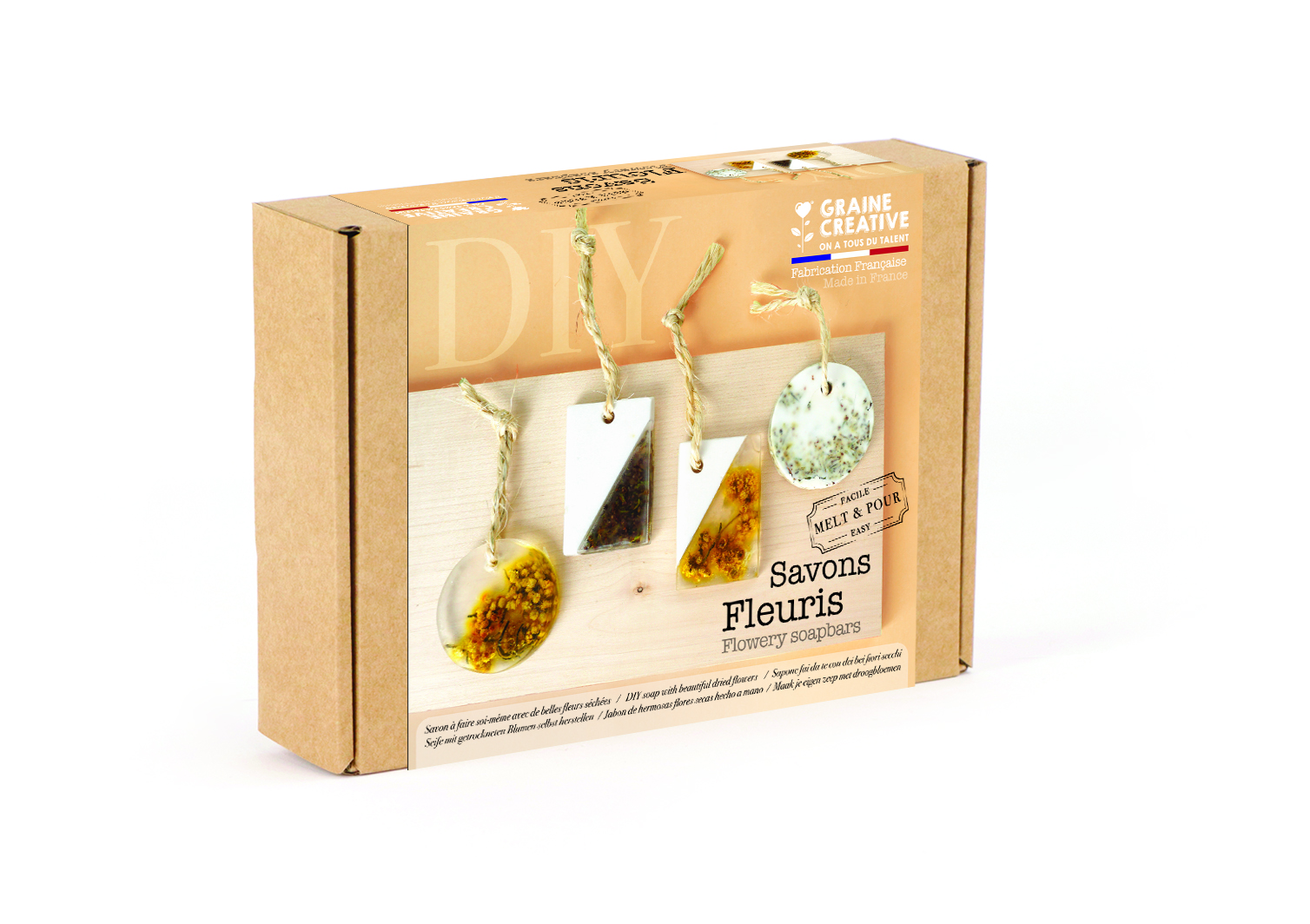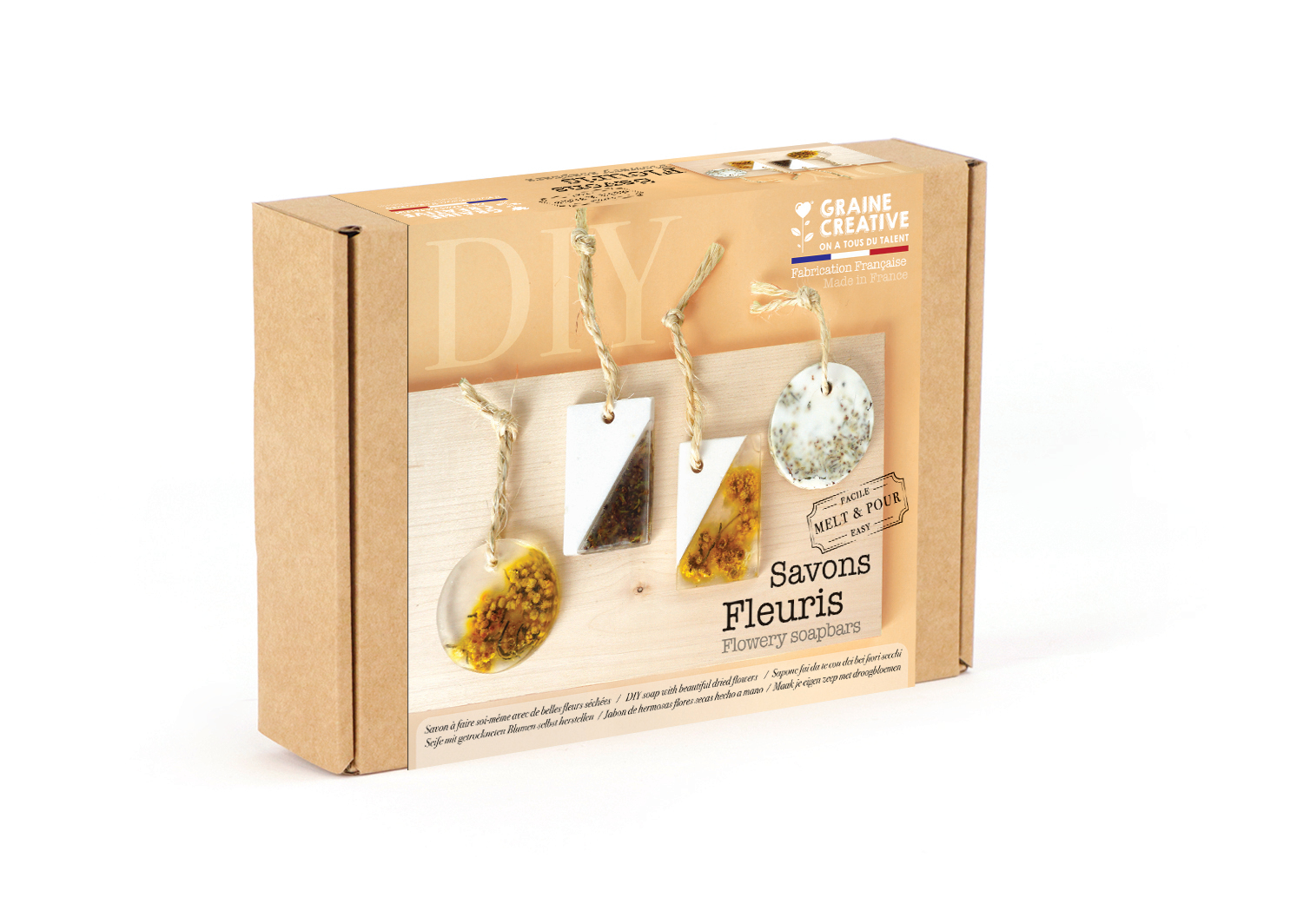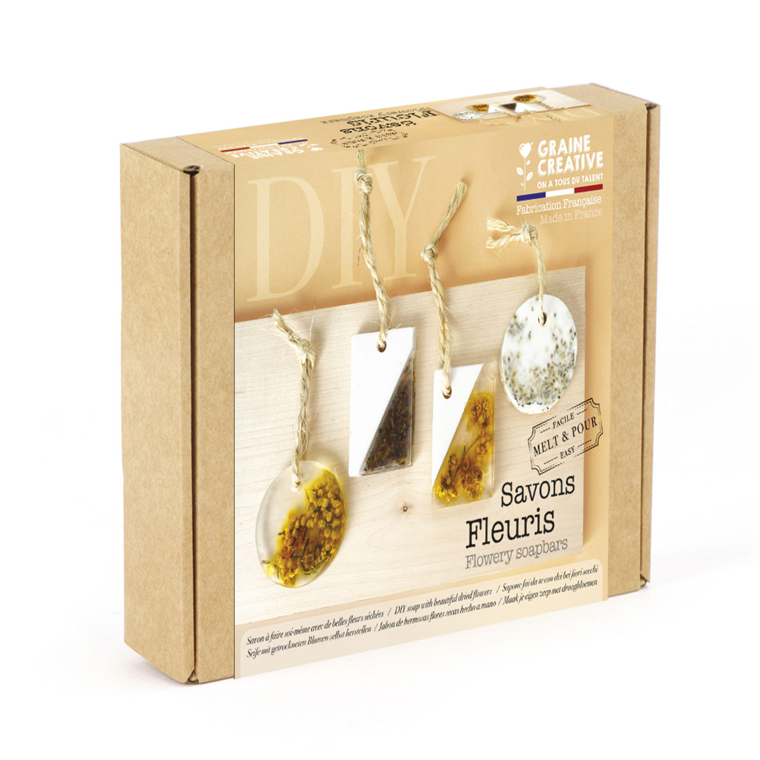 Un kit pour fabriquer ses propres savons à suspendre avec inclusions de fleurs séchées.