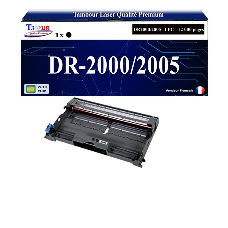 Remplacent les Tambour/Toner Brother DR2000/DR2005 - Capacité: 12 000 pages avec un rendement de 5% , repondent à toutes les normes européennes ISO 9001/14001, STMC, CE, ROHS . Encre de haute qualité qui garantie une excellence qualité d'impression - Marque T3AZUR