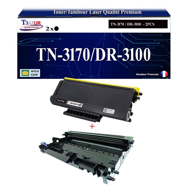 Remplacent les Tambour/Toner Brother DR3100/TN3130/ TN3170 - Capacité: 25 000 pages + 8 000 pages avec un rendement de 5% , repondent à toutes les normes européennes ISO 9001/14001, STMC, CE, ROHS - 100% Compatible - Encre de haute qualité qui garantie une excellence qualité d'impression - Marque T3AZUR