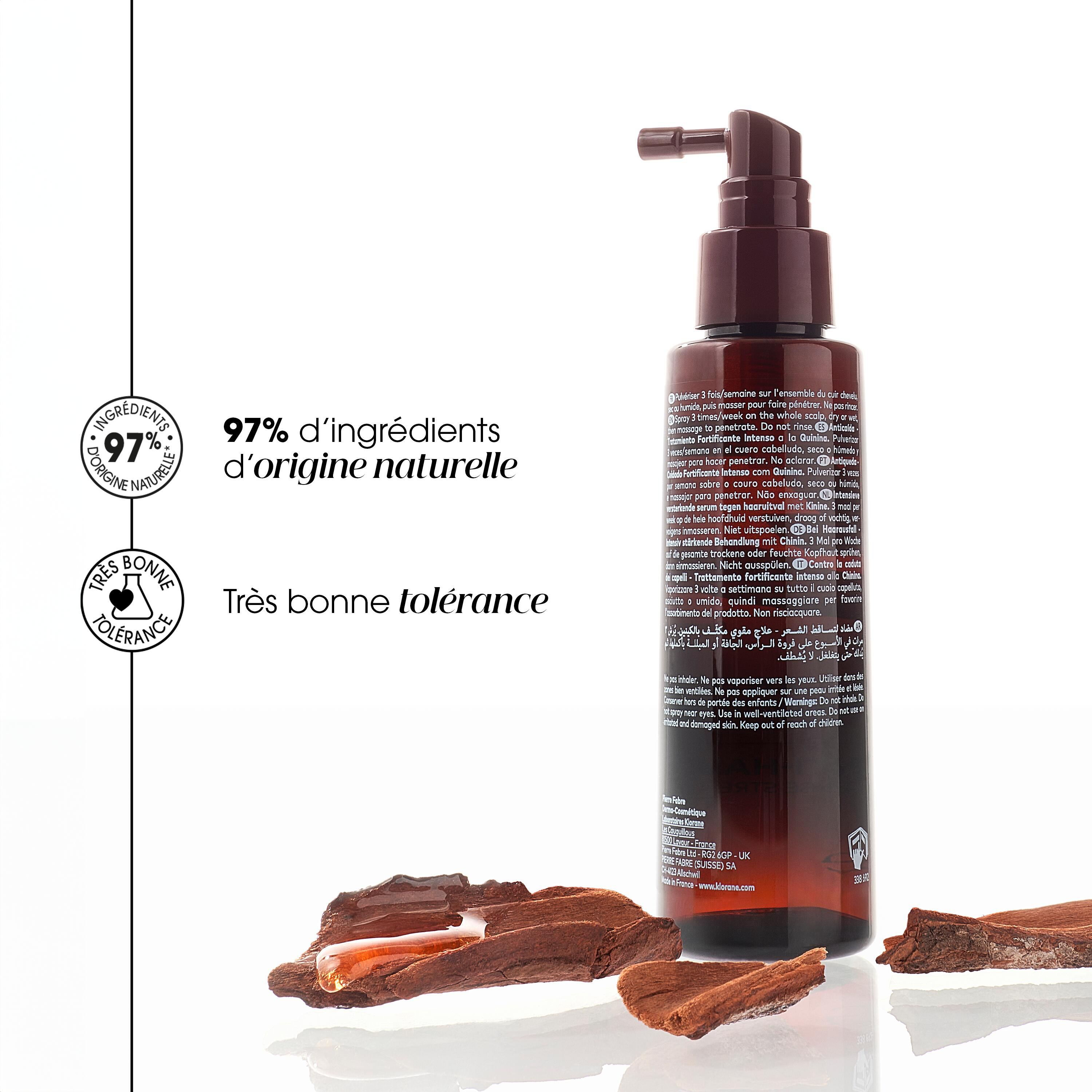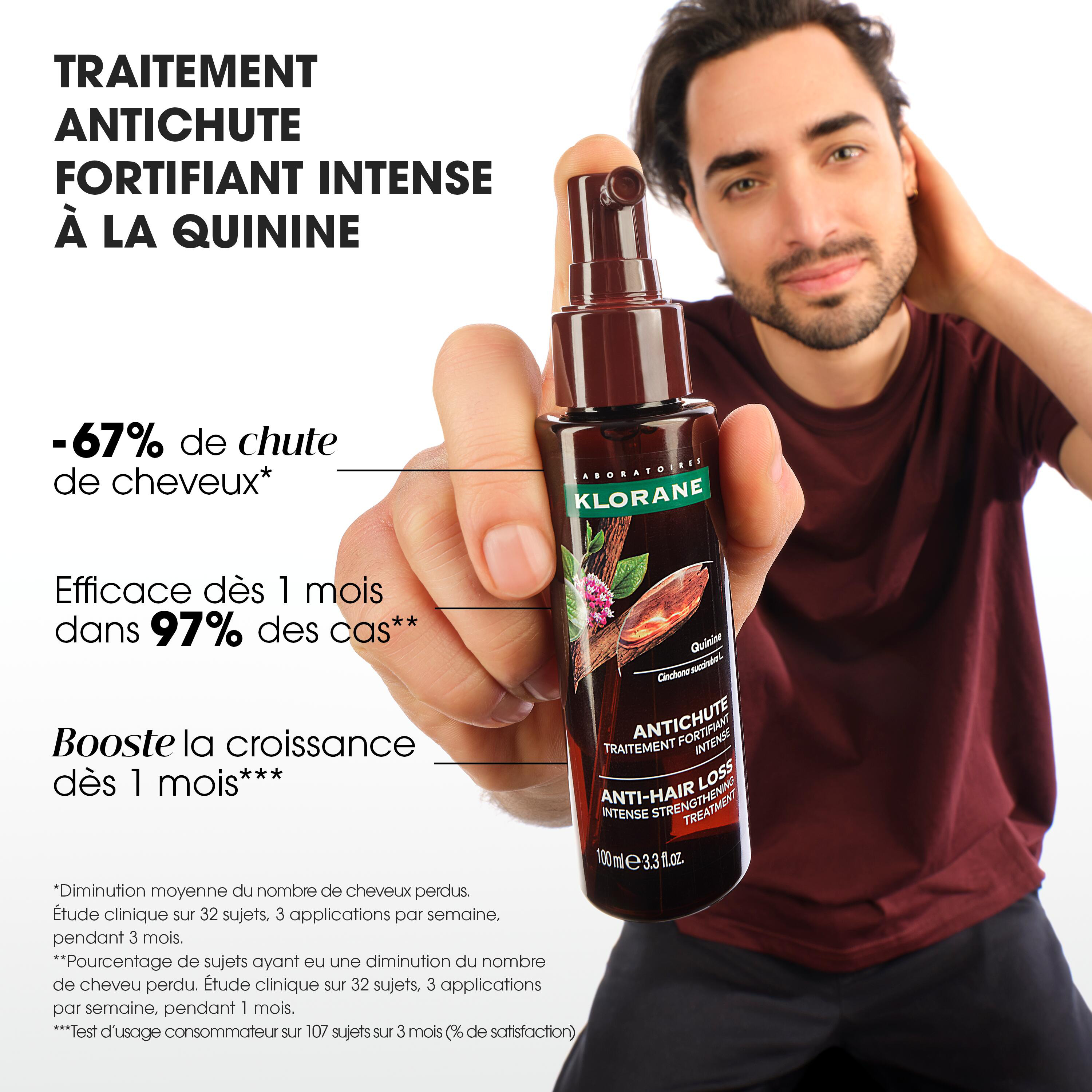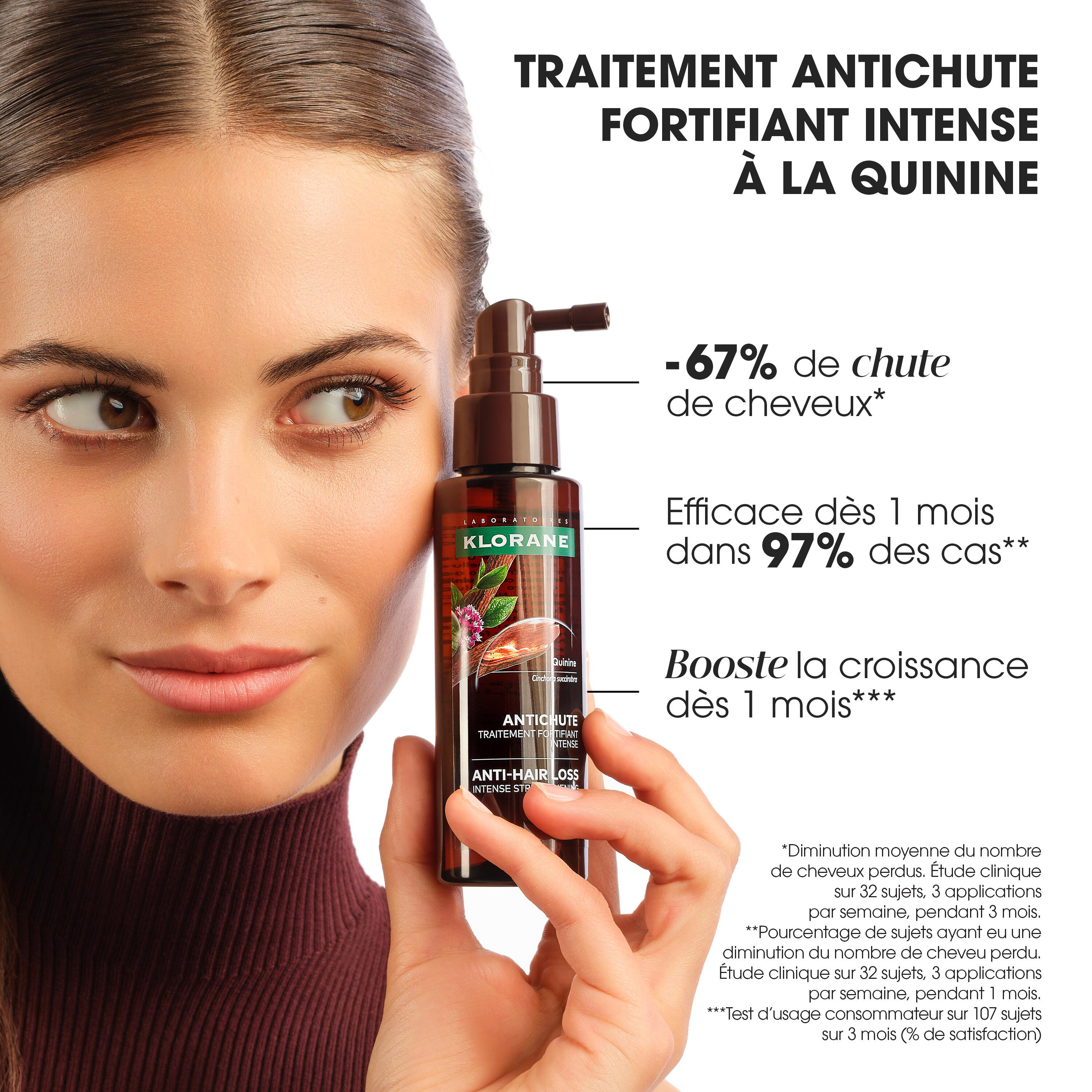 La chute de cheveux n'est pas une fatalité : avec des soins adaptés, elle ne doit plus être une source de stress ni occasioner une perte supplémentaire. Adapté à toutes les chutes de cheveux, le traitement antichute fortifiant intense à la Quinine issue du Quinquina médicinal de Klorane, est la solution d'origine naturelle* et efficace pour réduire de 67%** la chute des cheveux, les fortifier intensément, relancer leur croissance et les protéger des effets néfastes liés au stress. Formulée avec 97% d'ingrédients d'origine naturelle à partir de Quinine et de Caféine, qui renforce l'ancrage des cheveux et ralentit leur chute; ainsi que de Camu camu, un superfruit d'Amazonie à l'effet antistress***, cette cure chute de cheveux agit dès 1 mois**** pour freiner la perte des cheveux, les rendre visiblement plus forts et stimuler leur croissance. Dès 3 mois*****, la chevelure est ainsi plus dense, plus résistante et plus volumineuse. *97% d'ingrédients d'origine naturelle **Réduction moyenne du nombre de cheveux perdus. Etude clinique sur 32 sujets, 3 applications par semaine pendant 3 mois. ****Test in vitro *** Augmentation moyenne du nombre de cheveux existants en phase de croissance sur l’ensemble du cuir chevelu. Étude clinique sur 32 sujets, 3 applications par semaine, pendant 1 mois ****Test d'usage consommateur sur 107 sujets sur 3 mois