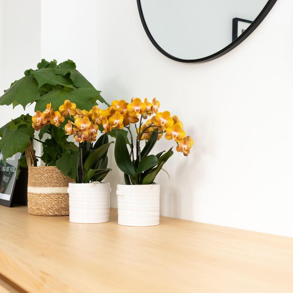 Plongez dans la nature avec cette magnifique orchidée orange botanique. Cette orchidée Phalaenopsis est un véritable accroche-regard dans votre maison ! Avez-vous déjà un pot coloré à la maison ? Remplissez-le ensuite d'une belle orchidée Phalaenopsis orange avec 3/4 brins dans un pot de 12 cm. On reconnaît cette orchidée à ses nombreuses fleurs orangées, aussi appelées multiflore. L'orchidée orange sans pot décoratif a une taille de pot de 12 cm. L'orchidée a l'air très naturelle avec ses fleurs d'oranger.  Irrigation : Arrosez votre orchidée une fois par semaine en plongeant le pot en plastique dans l'eau. Bien égoutter l'orchidée avant de la remettre dans son pot. Vérifiez les racines avant d'arroser votre plante d'intérieur. Les racines sont-elles gris clair ? Puis arrosez-les. Les racines sont-elles vert foncé ? Ensuite, vous n'avez pas besoin d'arroser. Offrez à une orchidée un soin supplémentaire en utilisant de la nourriture pour orchidées tous les deux mois. Placer l'orchidée : - Endroit lumineux, pas en plein soleil, avec des températures ambiantes comprises entre 17 et 22 degrés. - Ne placez pas la plante près d'un poêle ou d'un radiateur car l'air y est trop sec pour l'orchidée. - Pas à côté d'un bol de fruits. De nombreux types de fruits libèrent une substance naturelle qui accélère le processus de vieillissement. Comment expédier une plante d'intérieur ? Via un carton d'expédition spécialement conçu qui garantit que les plantes et les pots ne se cassent pas pendant l'expédition. *Nous travaillons avec des produits vivants, les espèces présentées peuvent donc légèrement différer des photos.