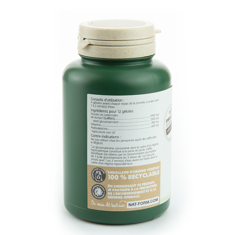 Ingrédients pour 12 gélules : Poudre de tubercules de konjac (SULFITES) 3900 mg dont glucomannane 3100 mg Gélatine 900 mg Maltodextrine 600 mg