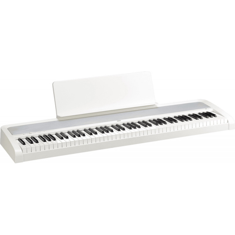 Pour le plaisir de jouer avant tout. La série B est disponible en deux teintes : noir et blanc. Dans la série B, le B2 bénéficie de nouveaux sons naturels de piano acoustique échantillonné en stéréo (Piano Allemand, Piano Japonais, Piano Italien, etc...), d'une amplification interne supérieure au B1 et d'un sentiment de jeu authentique en font l'instrument d'entrée de gamme idéal pour ceux en quête d'une sensation pure de piano acoustique. Cette série est équipée d'une interface USB, livrée avec un pack logiciel Korg et de trois pédales (en option) pour une modulation optimale du jeu. Caractéristiques identiques au B2-BK en blanc... Une qualité acoustique due à sa technologie d'échantillonnage stéréo. S'y ajoutent la restitution du bruit généré par le relâchement de la pédale et même les résonances sympathiques des cordes ! Compact et bien pensé, il se montre idéal pour les apprentis pianistes ou les amateurs en quête d'un piano numérique de qualité pour leur domicile ou leur résidence secondaire. Spécifications : - Clavier de 88 notes touché lourd NH-4 - Échantillonnage stéréo sur quatre couches stéréo note à note - Équipé de sonorités de piano acoustique : Allemand, Japonais, Italien... - 12 Sonorités internes - Interface USB type B - Livré d'origine avec une pédale de sustain métallique forme piano et d'un pack logiciel - Extension 3 pédales (en option) - Nouveau système d'amplification MFB Servo Technology pour un son ample, profond et précis de 2 x 15 Watts. - 120 notes de polyphonie - Fonction partner (séparation du clavier pour deux pianistes dans la même tessiture) - Le pupitre du B2 dispose d'une agrafe de page qui maintient les pages de la partition - Finition particulièrement soignée offrant un design sobre et moderne - Métronome intégré, réverbe, chorus, transposition, etc. - Dimensions : 1,312 × 336 × 117 mm - Poids : 11,4 Kg - Accessoires : adaptateur secteur, pupitre, pédale forte type piano - En options : pieds noirs (STB1-BK) - 3 pédales : PU-2