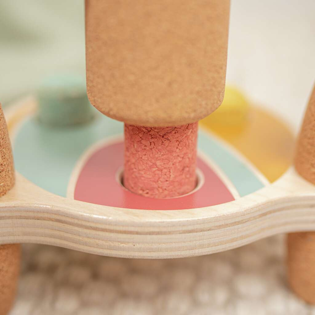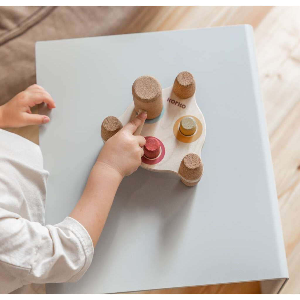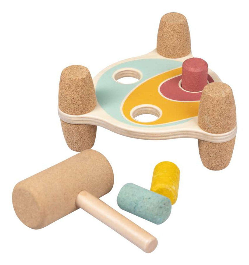 Plus produit Observez votre enfant explorer les causes et effets en guidant les bouchons de liège à travers notre banc à marteler.