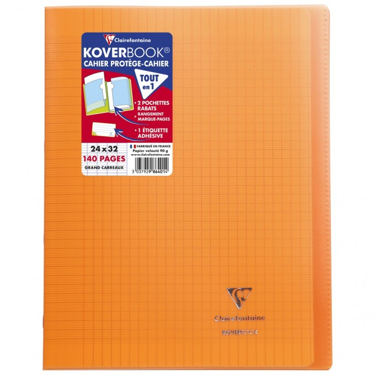Koverbook le cahier pratique et économique, véritable 2 en 1 avec sa couverture en plastique ainsi que ses 2 rabats faisant à la fois office de marque-pages et de pochettes de rangement ! Fourni avec 1 étiquette adhésive. Plus besoin de protège-cahier ! Couverture solide et protectrice en polypropylène transparent avec deux grands rabats à pochette pour marquer les pages et ranger les documents utiles ! Véritable 2 en 1 : cahier et protège-cahier à rabats Fourni avec 1 étiquette adhésive pour personnaliser le cahier (nom, prénom, matière, classe...) Papier Clairefontaine Vélin Velouté 90g, pour une sensation de glisse unique. Certifié PEFC, pour la gestion durable des forêts Fabriqué en France