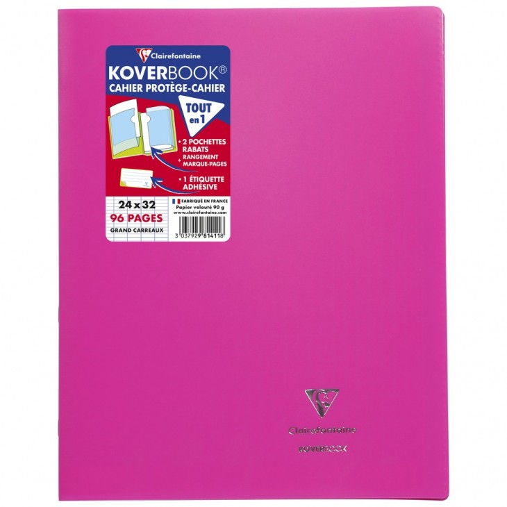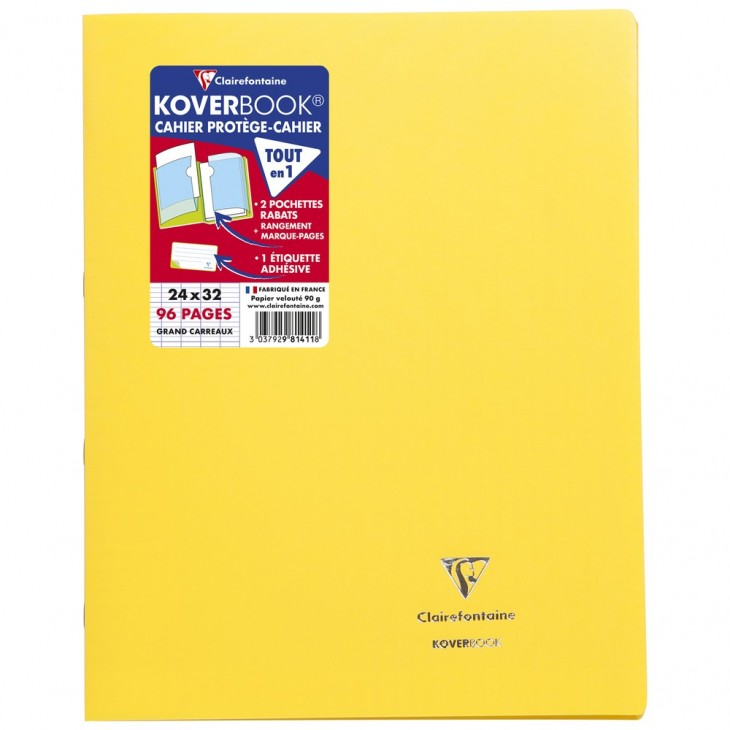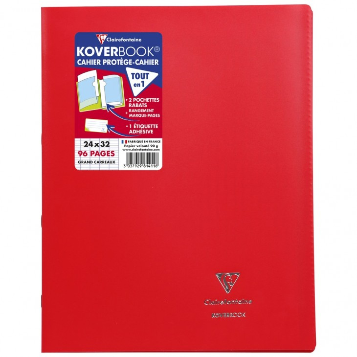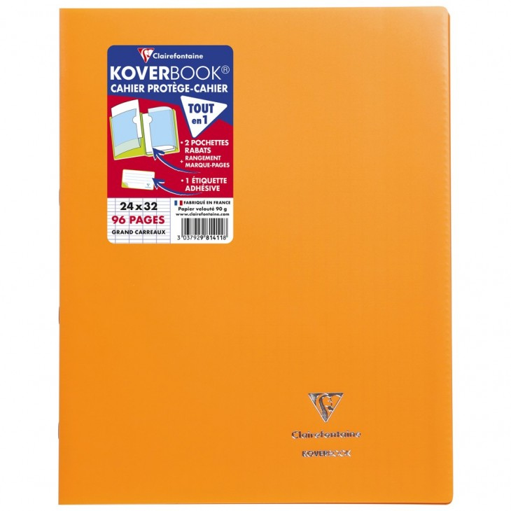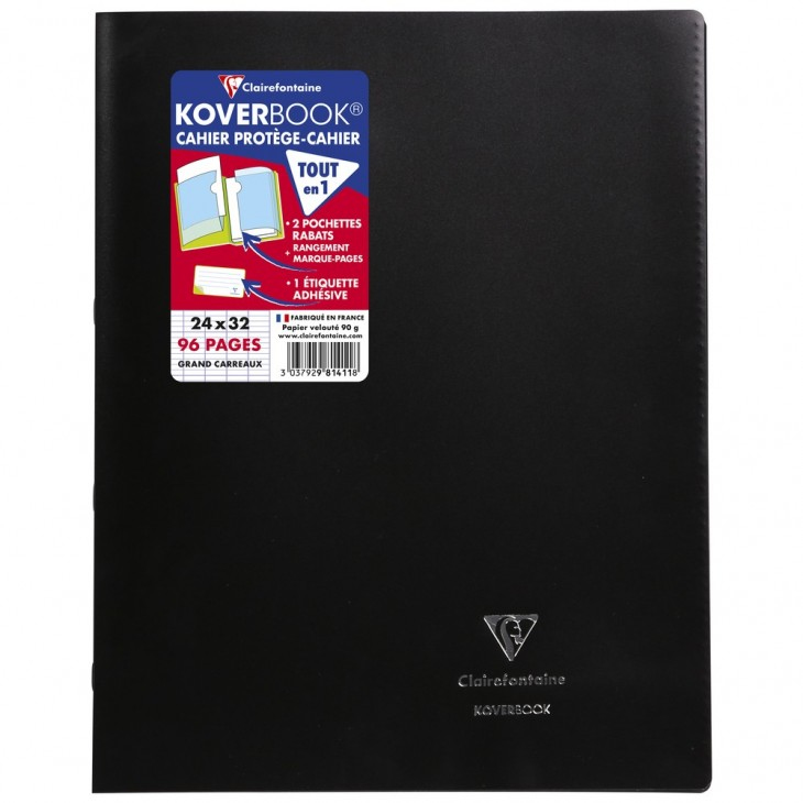 Koverbook le cahier pratique et économique, véritable 2 en 1 avec sa couverture en plastique ainsi que ses 2 rabats faisant à la fois office de marque-pages et de pochettes de rangement ! Fourni avec 1 étiquette adhésive. Plus besoin de protège-cahier ! Couverture solide et protectrice en polypropylène opaque avec deux grands rabats à pochette pour marquer les pages et ranger les documents utiles ! Véritable 2 en 1 : cahier et protège-cahier à rabats Fourni avec 1 étiquette adhésive pour personnaliser le cahier (nom, prénom, matière, classe...) Papier Clairefontaine Vélin Velouté 90g, pour une sensation de glisse unique. Certifié PEFC, pour la gestion durable des forêts Fabriqué en France