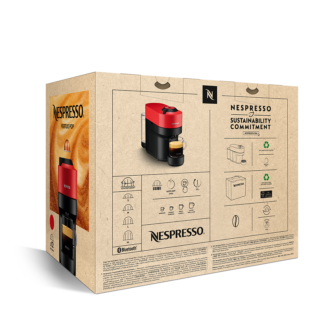 Dimensions : 13.6 x 25 x 42.6 cm 4 TAILLES DE TASSE Envie d’un Espresso, d’un Double Espresso, d’un Gran Lungo ou d’un Mug ? Aucun problème, votre Vertuo Pop suit vos envies tout au long de la journée. Image machine pop UN DESIGN COMPACT POUR TOUS LES INTÉRIEURS Une petite taille pour une grande capacité, la Vertuo Pop est simple et intuitive, avec un seul bouton elle vous offre un résultat en tasse de haute qualité. Images plusieurs couleurs UN UNIVERS HAUT EN COULEUR Avec ses 6 coloris la Vertuo Pop s’adapte à tous les syles ! Des couleurs douces ou acidulées pour accompagner avec énergie tous vos instants café. Image Texte On-Off UNE MACHINE RESPONSABLE La machine s’éteint automatiquement après 2 min d’inutilisation et les capsules Vertuo Pop sont fabriquées à partir d’aluminium recyclable. À CHAQUE CAPSULE UNE NOUVELLE EXPÉRIENCE Choisir Vertuo Pop, c’est choisir parmi plus de 30 cafés à adapter selon vos envies. D’une simple touche, vous pouvez réaliser avec précision un petit ou un grand café, léger, intense ou gourmand. C’est vous qui décidez ! TECHNOLOGIE DE CENTRIFUSIONTM, INTELLIGENTE ET INTUITIVE Chaque capsule Vertuo possède ses propres caractéristiques mais toutes, grâce au système d’extraction par centrifusionTM, donnent naturellement naissance à une mousse de café soyeuse et onctueuse. Pour une expérience gustative unique à chaque dégustation. MACHINE ÉCO-RESPONSABLE ET CONSOMMATION D’ÉNERGIE MAITRISÉE En reconnaissant le code-barres présent sur chaque capsule, la machine adapte automatiquement ses paramètres d’extraction en réglant le volume d’eau, la température, le temps d’infusion et la vitesse de rotation de la capsule. TECHNOLOGIE DE CENTRIFUSIONTM, INTELLIGENTE ET INTUITIVE Les capsules donnent toutes les informations à votre machine, de votre côté nous n’avez qu’une chose à faire : appuyer ! Le voyant lumineux de la machine Vertuo Pop vous indique que la capsule a été reconnue et que les paramètres d’extraction sont ajustés en conséquence.